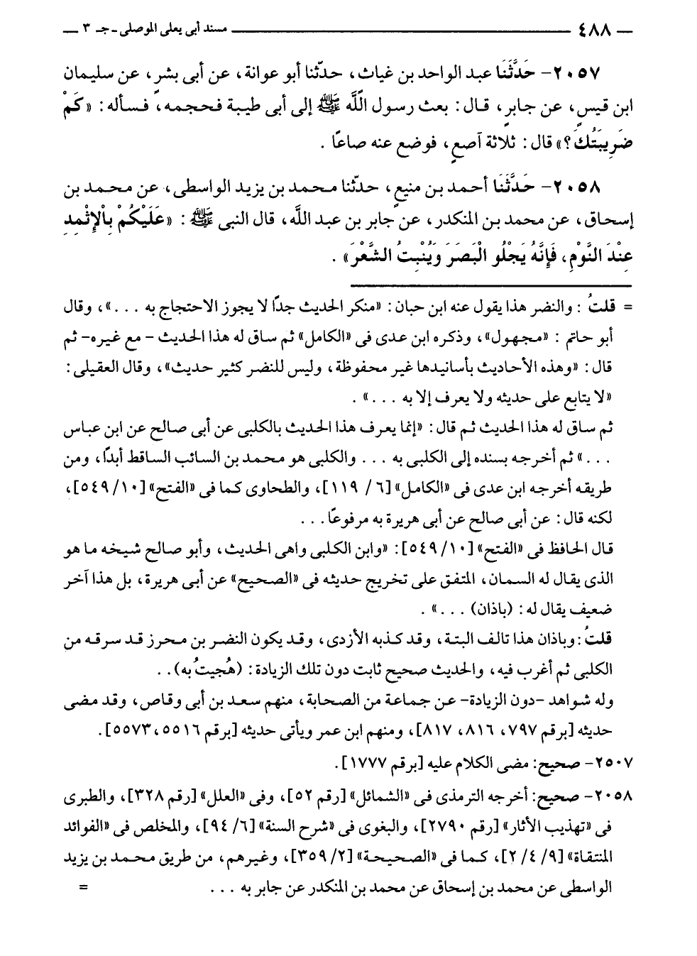 ٢٠٥٨ - حَدَّثَنَا أحمد بن منيعٍ، حدّثنا محمد بن يزيد الواسطى، عن محمد بن إسحاق، عن محمد بن المنكدر، عن جابر بن عبد الله، قال النبي - صلى الله عليه وسلم -: "عَلَيْكُمْ بِالإِثْمِدِ عِنْدَ النَّوْمِ، فَإِنَّهُ يَجْلُو الْبَصَرَ وَيُنْبِتُ الشَّعْرَ".