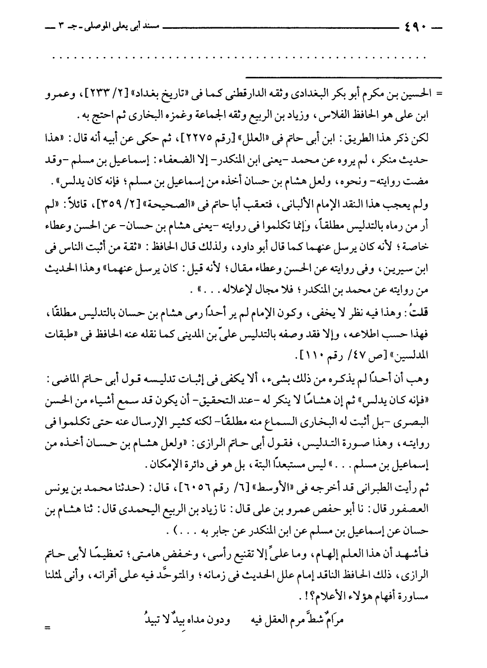 وهب أن أحدًا لم يذكره من ذلك بشئ، ألا يكفى في إثبات تدليسه قول أبى حاتم الماضى: "فإنه كان يدلس" ثم إن هشامًا لا ينكر له - عند التحقيق - أن يكون قد سمع أشياء من الحسن البصرى - بل أثبت له البخارى السماع منه مطلقًا - لكنه كثير الإرسال عنه حتى تكلموا في روايته، وهذا صورة التدليس، فقول أبى حاتم الرازى: "ولعل هشام بن حسان أخذه من إسماعيل بن مسلم ... " ليس مستبعدًا البتة، بل هو في دائرة الإمكان.