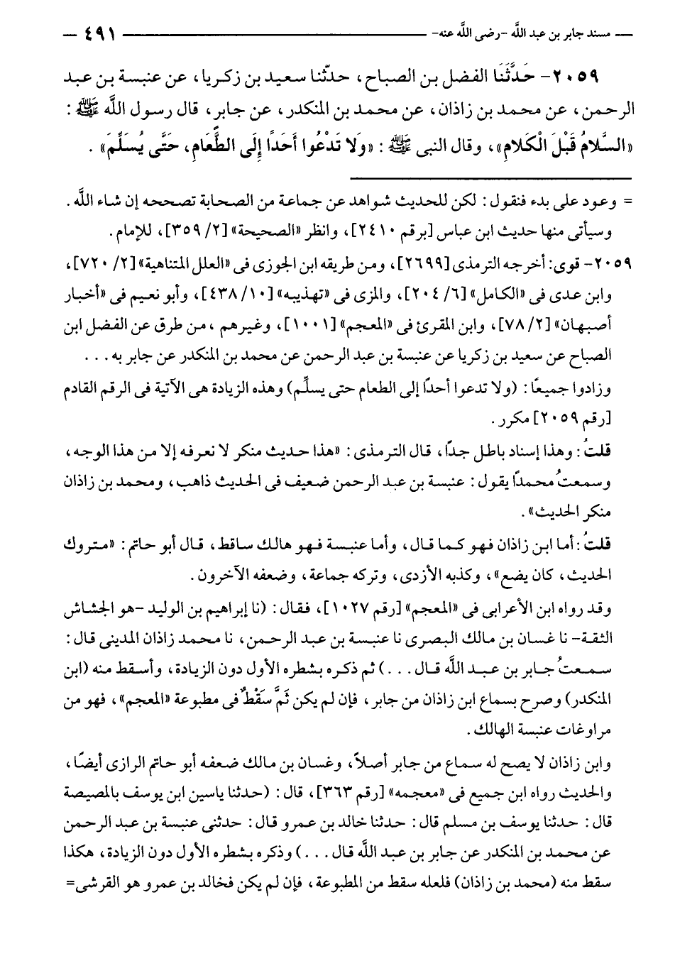 ٢٠٥٩ - حَدَّثَنَا الفضل بن الصباح، حدّثنا سعيد بن زكريا، عن عنبسة بن عبد الرحمن، عن محمد بن زاذان، عن محمد بن المنكدر، عن جابر، قال رسول الله - صلى الله عليه وسلم -: "السَّلامُ قَبْلَ الْكَلامِ"، وقال النبي - صلى الله عليه وسلم -: "وَلا تَدْعُوا أَحَدًا إِلَى الطَّعَامِ، حَتَّى يُسَلِّمَ".