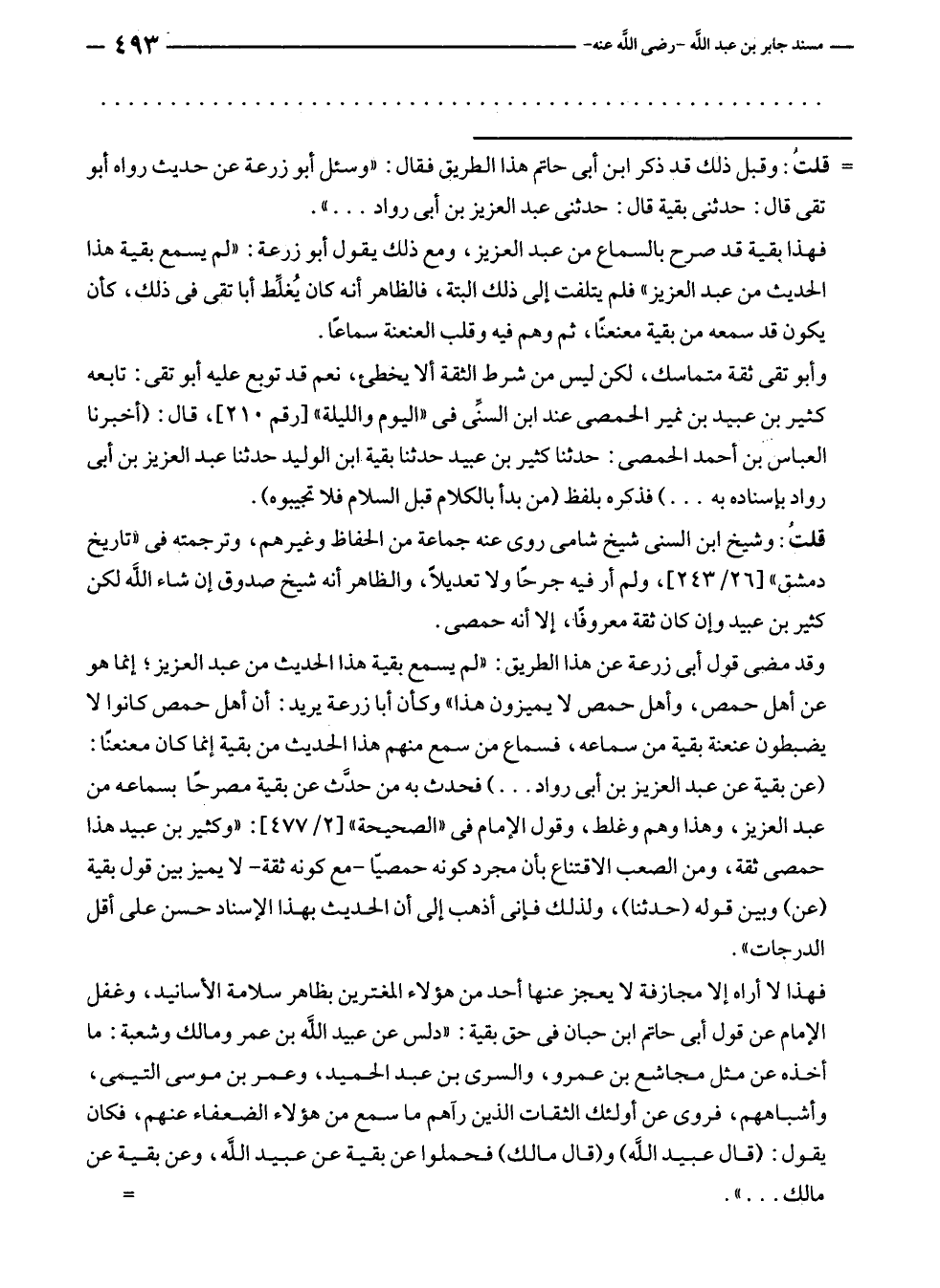 فهذا لا أراه إلا مجازفة لا يعجز عنها أحد من هؤلاء المغترين بظاهر سلامة الأسانيد، وغفل الإمام عن قول أبى حاتم ابن حبان في حق بقية: "دلس عن عبيد الله بن عمر ومالك وشعبة: ما أخذه عن مثل مجاشع بن عمرو، والسري بن عبد الحميد، وعمر بن موسى التيمى، وأشباههم، فروى عن أولئك الثقات الذين رآهم ما سمع من هؤلاء الضعفاء عنهم، فكان يقول: (قال عبيد الله) و (قال مالك) فحملوا عن بقية عن عبيد الله، وعن بقية عن مالك ... ". =