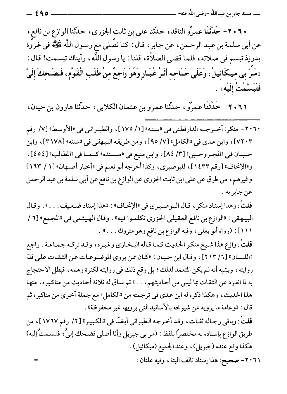 ٢٠٦٠ - حَدَّثَنَا عمروٌ الناقد، حدّثنا على بن ثابت الجزرى، حدّثنا الوازع بن نافعٍ، عن أبى سلمة بن عبد الرحمن، عن جابر، قال: كنا نصلى مع رسول الله - صلى الله عليه وسلم - في غزوة بدرٍ إذ تبسم في صلاته، فلما قضى الصلَّاة، قلنا: يا رسول الله، رأيناك تبسمت! قال: "مَرَّ بِى مِيكَائِيلُ، وَعَلَى جَنَاحِهِ أَثَرُ غُبَارٍ وَهُوَ رَاجِعٌ مِنْ طَلَبِ الْقَوْمِ، فَضَحِكَ إلَيَّ فَتَبَسَّمْتُ إليْهِ".