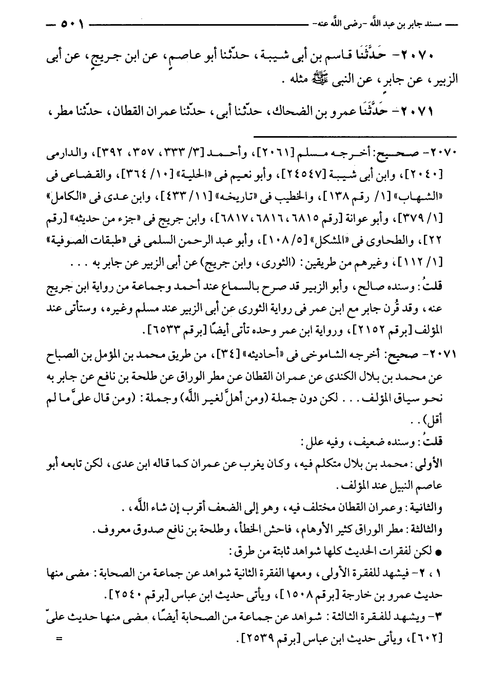 ٢٠٧٠ - صحيح: أخرجه مسلم [٢٠٦١]، وأحمد [٣/ ٣٣٣، ٣٥٧، ٣٩٢]، والدارمى [٢٠٤٠]، وابن أبى شيبة [٢٤٥٤٧]، وأبو نعيم في "الحلية" [١٠/ ٣٦٤]، والقضاعى في "الشهاب" [١/ رقم ١٣٨]، والخطيب في "تاريخه" [١١/ ٤٣٣]، وابن عدى في "الكامل" [١/ ٣٧٩]، وأبو عوانة [رقم ٦٨١٥، ٦٨١٦، ٦٨١٧]، وابن جريج في "جزء من حديثه" [رقم ٢٢]، والطحاوى في "المشكل" [٥/ ١٠٨]، وأبو عبد الرحمن السلمى في "طبقات الصوفية" [١/ ١١٢]، وغيرهم من طريقين: (الثورى، وابن جريج) عن أبى الزبير عن جابر به ...
