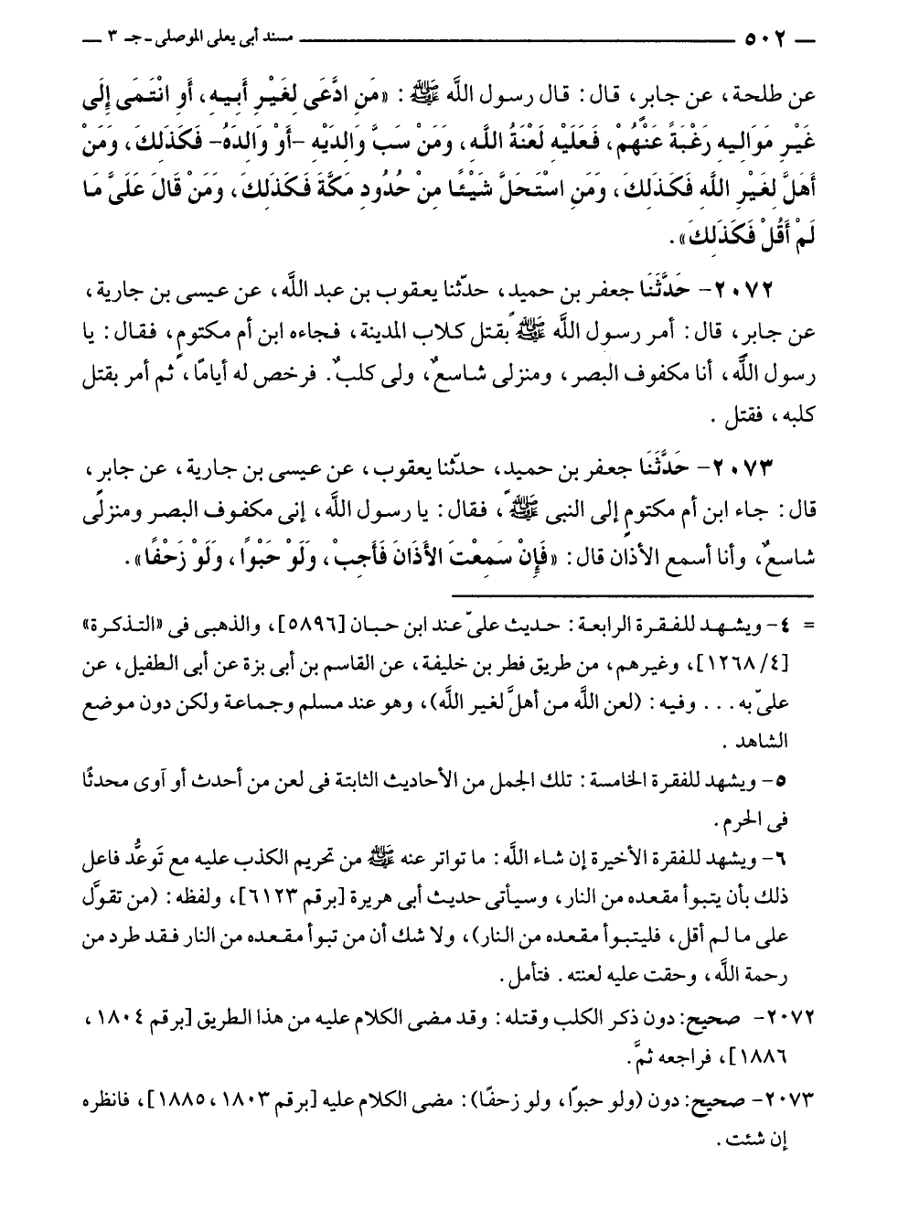 ٢٠٧٢ - حَدَّثَنَا جعفر بن حميد، حدّثنا يعقوب بن عبد الله، عن عيسى بن جارية، عَن جابرٍ، قال: أمر رسول الله - صلى الله عليه وسلم - بقتل كلاب المدينة، فجاءه ابن أم مكتومٍ، فقال: يا رسول الله، أنا مكفوف البصر، ومنزلى شاسعٌ، ولى كلبٌ. فرخص له أيامًا، ثم أمر بقتل كلبه، فقتل.