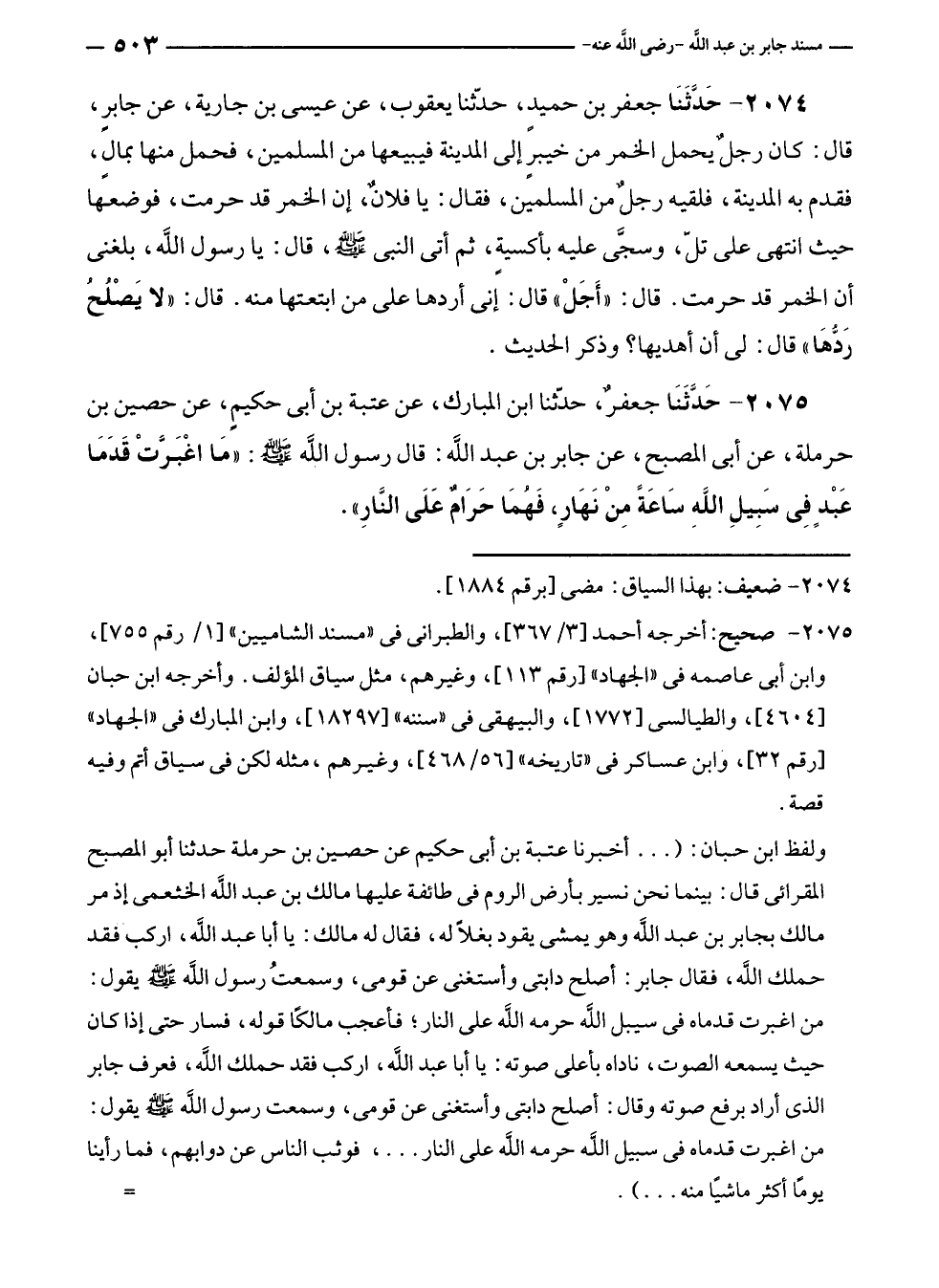 ٢٠٧٥ - حَدَّثَنَا جعفرٌ، حدّثنا ابن المبارك، عن عتبة بن أبى حكيمٍ، عن حصين بن حرملة، عن أبى المصبح، عن جابر بن عبد الله: قال رسول الله - صلى الله عليه وسلم -: "مَا اغْبَرَّتْ قَدَمَا عَبْدٍ فِي سَبِيلِ اللَّهِ سَاعَةً مِنْ نَهَارٍ، فَهُمَا حَرَامٌ عَلَى النَّارِ".