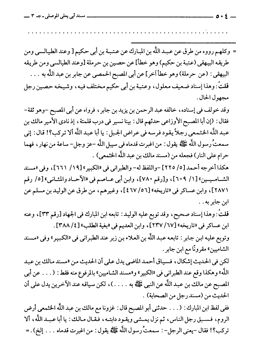= وكلهم رووه من طرق عن عبد الله بن المبارك عن عتبة بن أبى حكيم [وعند الطيالسى ومن طريقه البيهقى (عتبة بن حكيم) وهو خطأ] عن حصين بن حرملة [وعند الطيالسى ومن طريقه البيهقى: (عن حرملة) وهو خطأ آخر] عن أبى المصبح الحمصى عن جابر بن عبد الله به ...