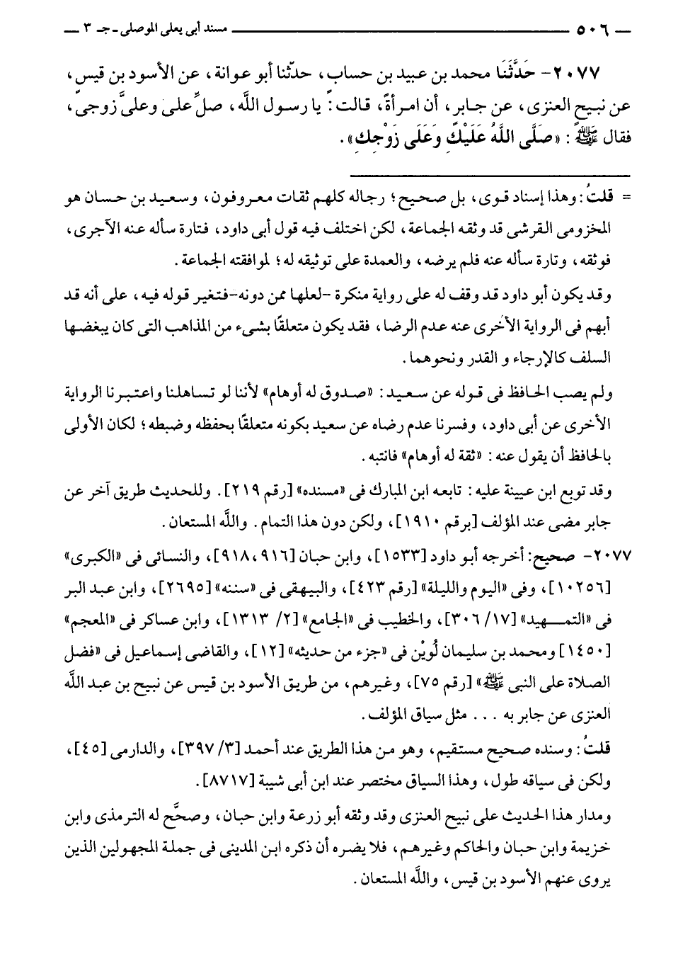 ٢٠٧٧ - حَدَّثَنَا محمد بن عبيد بن حساب، حدّثنا أبو عوانة، عن الأسود بن قيسٍ، عن نبيح العنزى، عن جابر، أن امرأةً، قالت: يا رسول الله، صلِّ على وعليَّ زوجى، فقال - صلى الله عليه وسلم -: "صَلَّى اللهُ عَلَيْك وَعَلَى زَوْجِكِ".