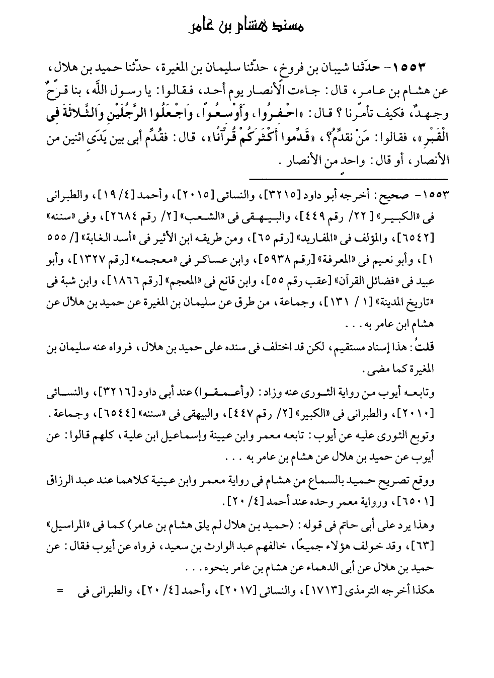 ١٥٥٣ - حدّثنا شيبان بن فروخٍ، حدّثنا سليمان بن المغيرة، حدّثنا حميد بن هلالٍ، عن هشام بن عامرٍ، قال: جاءت الأنصار يوم أحدٍ، فقالوا: يا رسول الله، بنا قرحٌ وجهدٌ، فكيف تأمرنا؟ قال: "احْفِروا، وَأَوْسِعُوا، وَاجْعَلُوا الرَّجُلَيْنِ وَالثَّلاثَةَ فِي الْقَبْرِ"، فقالوا: مَنْ نقدِّمُ؟، "قَدِّموا أَكْثَرَكُمْ قُرْآنًا"، قال: فقُدِّم أبى بين يَدَى اثنين من الأنصار، أو قال: واحد من الأنصار.