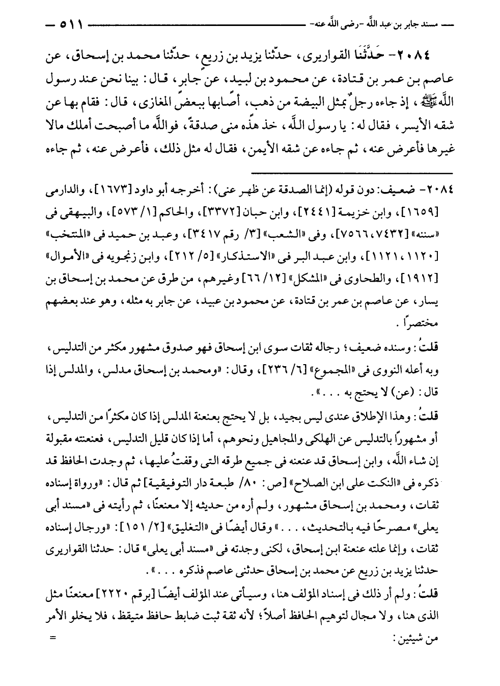 ٢٠٨٤ - حَدَّثَنَا القواريرى، حدّثنا يزيد بن زريع، حدّثنا محمد بن إسحاق، عن عاصم بن عمر بن قتادة، عن محمود بن لبيدٍ، عن جابرٍ، قال بينا نحن عند رسول الله - صلى الله عليه وسلم -، إذ جاءه رجلٌ بمثل البيضة من ذهبٍ، أصابها ببعض المغازى، قال: فقام بها عن شقه الأيسر، فقال له: يا رسول الله، خذ هذه منى صدقةً، فواللَّه ما أصبحت أملك مالا غيرها فأعرض عنه، ثم جاءه عن شقه الأيمن، فقال له مثل ذلك، فأعرض عنه، ثم جاءه