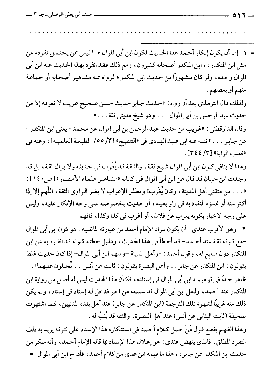 ظاهر جدًّا في توهيمه ابن أبى الموال في إسناده، فكأن هذا الحديث ليس له أصل من رواية ابن المنكدر عند أحمد، ولعل ابن أبى الموال قد سمعه من آخر فدخل له إسناد في إسناد، ولم يكن ذلك منه غريبًا لشهرة تلك الترجمة (ابن المنكدر عن جابر) عند أهل بلده المدنيين، كما اشتهرت صحيفة (ثابت البنانى عن أنس) عند أهل البصرة، والثقة قد يُشبَّه له.