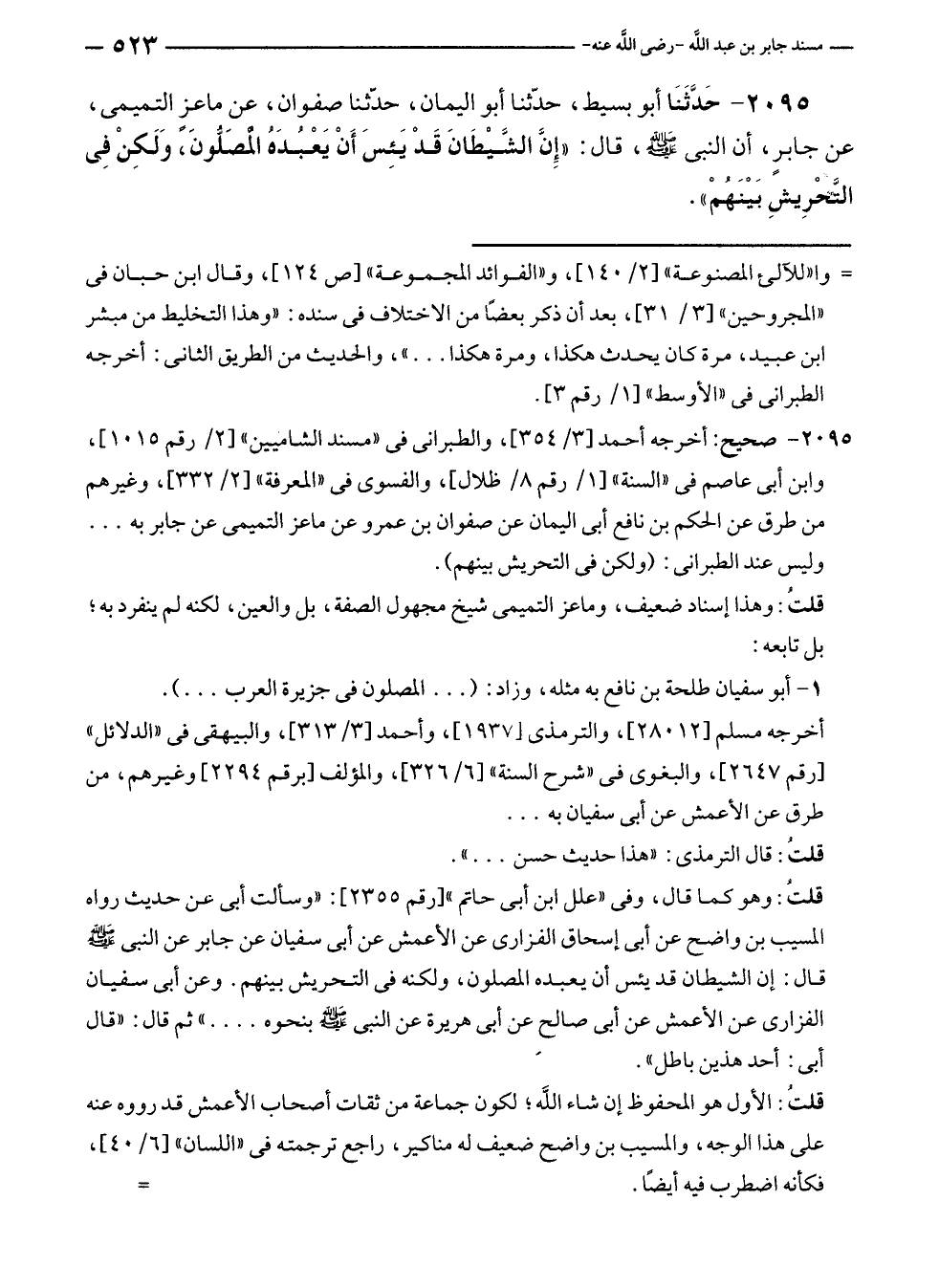 ٢٠٩٥ - حَدَّثَنَا أبو بسيط، حدّثنا أبو اليمان، حدّثنا صفوان، عن ماعزٍ التميمى، عن جابرٍ، أن النبي - صلى الله عليه وسلم -، قال: "إِنَّ الشَّيْطَانَ قَدْ يَئسَ أَنْ يَعْبُدَهُ المصَلُّونَ، وَلَكِنْ فِي التَّحْرِيشِ بَيْنَهُمْ".