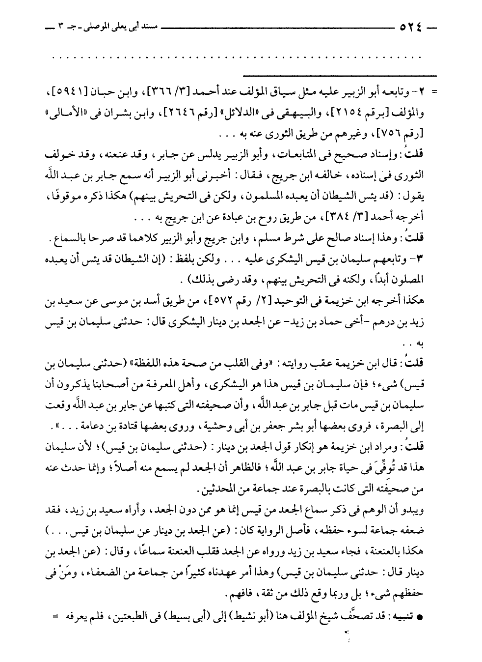 قلتُ: وإسناد صحيح في المتابعات، وأبو الزبير يدلس عن جابر، وقد عنعنه، وقد خولف الثورى في إسناده، خالفه ابن جريج، فقال: أخبرنى أبو الزبير أنه سمع جابر بن عبد الله يقول: (قد يئس الشيطان أن يعبده المسلمون، ولكن في التحريش بينهم) هكذا ذكره موقوفًا، أخرجه أحمد [٣/ ٣٨٤]، من طريق روح بن عبادة عن ابن جريج به ...