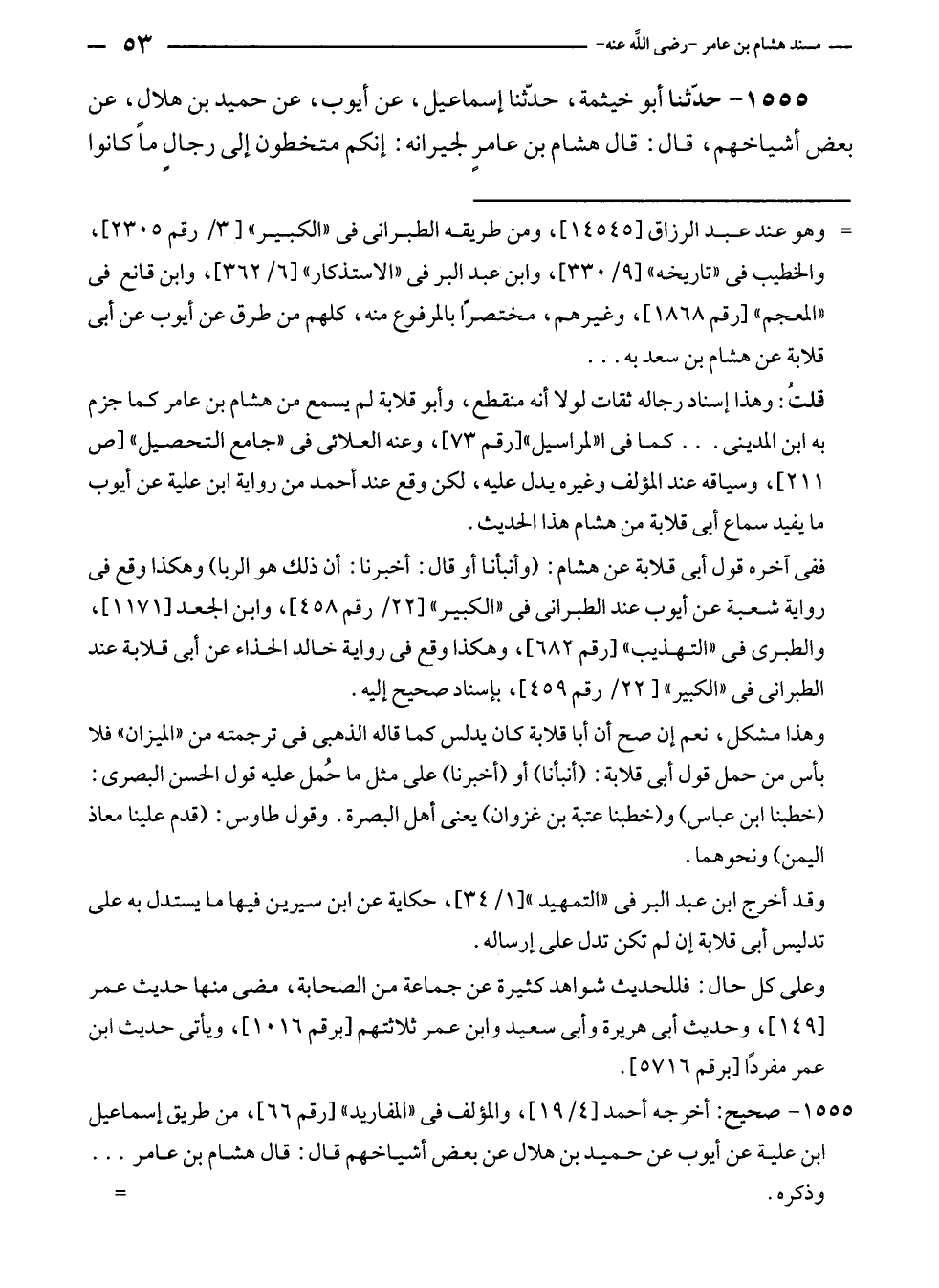 قلتُ: وهذا إسناد رجاله ثقات لولا أنه منقطع، وأبو قلابة لم يسمع من هشام بن عامر كما جزم به ابن المدينى ... كما في "المراسيل" [رقم ٧٣]، وعنه العلائى في "جامع التحصيل" [ص ٢١١]، وسياقه عند المؤلف وغيره يدل عليه، لكن وقع عند أحمد من رواية ابن علية عن أيوب ما يفيد سماع أبى قلابة من هشام هذا الحديث.