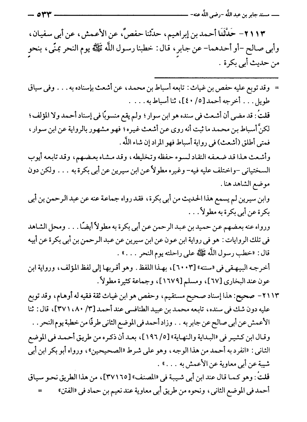 ٢١١٣ - صحيح: هذا إسناد صحيح مستقيم، وحفص هو ابن غياث ثقة فقيه له أوهام، وقد توبع عليه دون شك في سنده، تابعه محمد بن عبيد الطنافسى عند أحمد [٣/ ٨٥، ٣٧١]، قال: ثنا الأعمش عن أبى صالح عن جابر به .. وزاد أحمد في الموضع الثاني طرفًا من خطبة يوم النحر ..