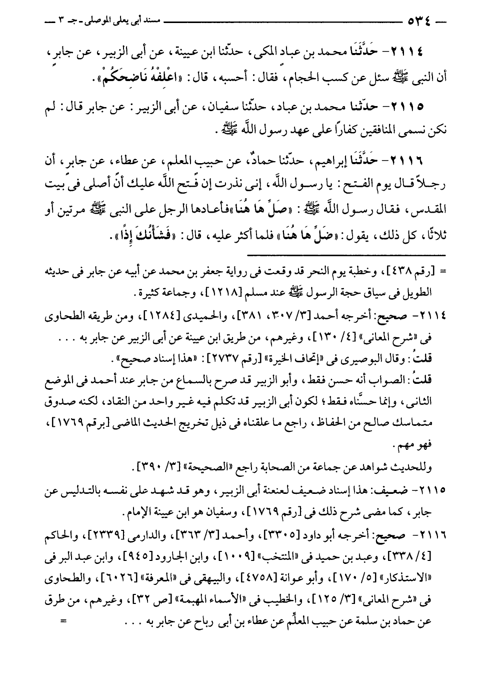 ٢١١٤ - صحيح: أخرجه أحمد [٣/ ٣٥٧، ٣٨١]، والحميدى [١٢٨٤]، ومن طريقه الطحاوى في "شرح المعانى" [٤/ ١٣٠]، وغيرهم، من طريق ابن عيينة عن أبى الزبير عن جابر به ...