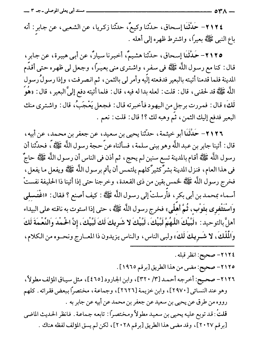 ٢١٢٦ - صحيح: أخرجه أحمد [٣/ ٣٢٠]، وابن الجارود [٤٦٥]، مثل سياق المؤلف مطولًا، وهو عند النسائي [٢٩٧٠]، وابن خزيمة [٢٦٢٦]، وجماعة، مختصرًا ببعض فقراته. كلهم رووه من طرق عن يحيى بن سعيد عن جعفر بن محمد عن أبيه عن جابر به.