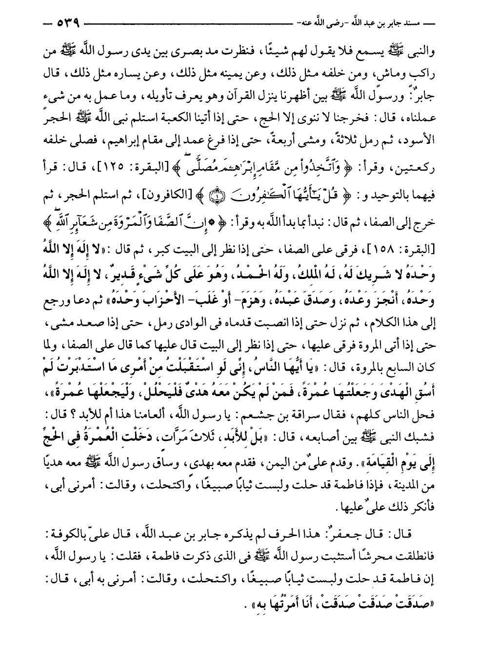 قال: قال جعفرٌ: هذا الحرف لم يذكره جابر بن عبد الله، قال عليّ بالكوفة: فانطلقت محرشًا أستثبت رسول الله - صلى الله عليه وسلم - في الذي ذكرت فاطمة، فقلت: يا رسول الله، إن فاطمة قد حلت ولبست ثيابًا صبيغًا، واكتحلت، وقالت: أمرنى به أبى، قال: "صَدَقَتْ صَدَقَتْ صَدَقَتْ، أَنَا أَمَرْتُهَا بِهِ".