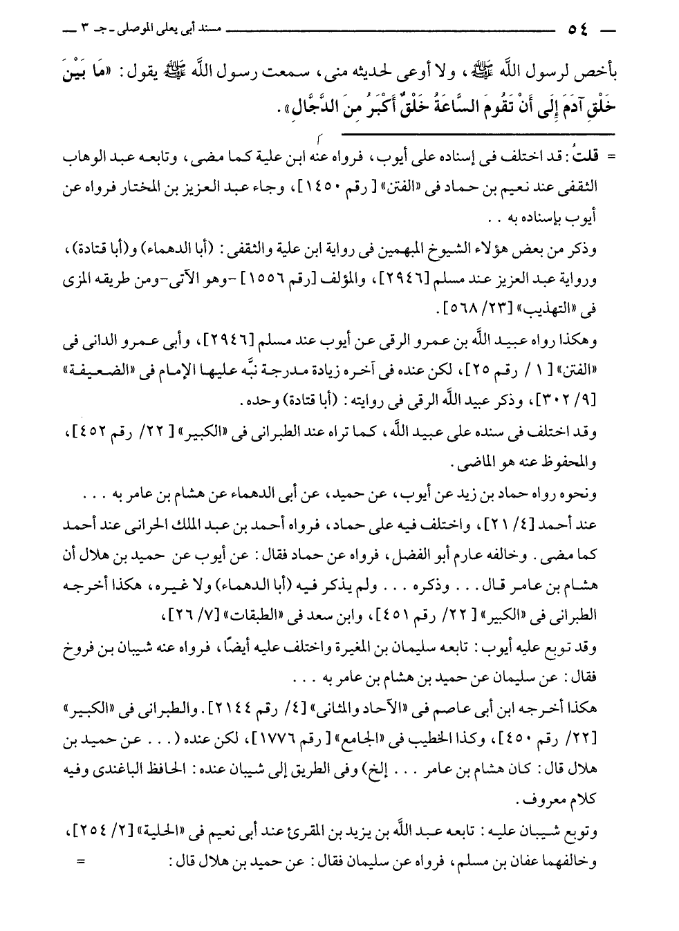 ونحوه رواه حماد بن زيد عن أيوب، عن حميد، عن أبى الدهماء عن هشام بن عامر به ...