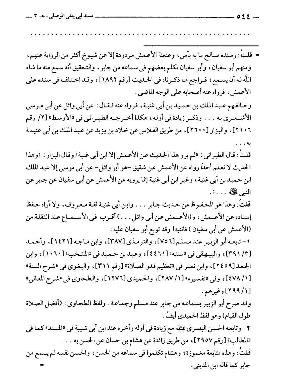= قلتُ: وسنده صالح ما به بأس، وعنعنة الأعمش مردودة إلا عن شيوخ أكثر من الرواية عنهم، ومنهم أبو سفيان، وأبو سفيان تكلم بعضهم في سماعه من جابر، والتحقيق أنه سمع منه ما شاء الله له أن يسمع؛ فراجع ما ذكرناه في الحديث [رقم ١٨٩٢]، وقد اختلف في سنده على الأعمش، فرواه عنه أصحابه على الوجه الماضى.