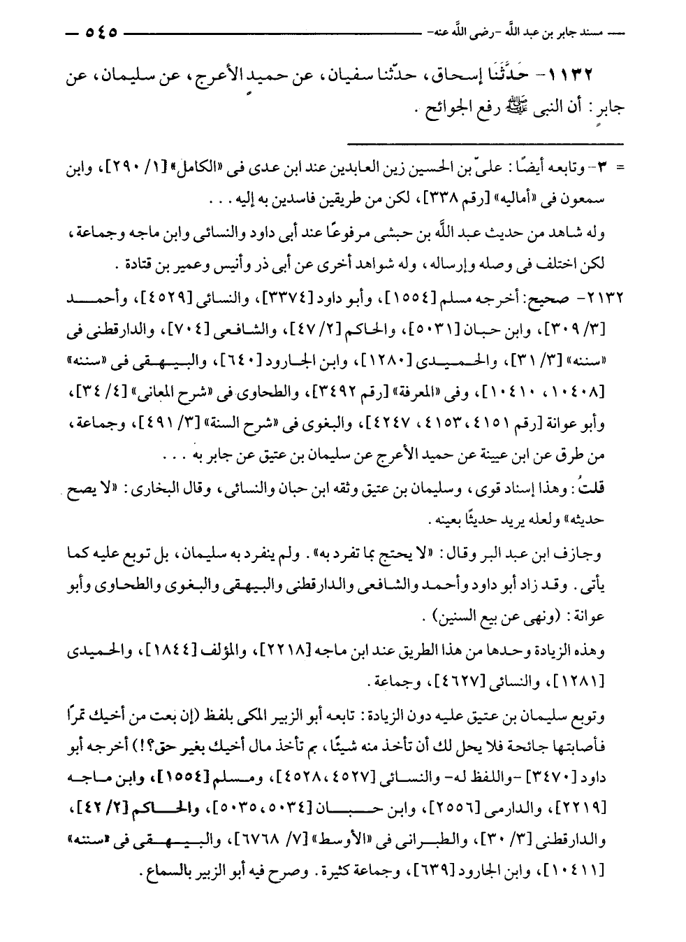 ١١٣٢ - حَدَّثَنَا إسحاق، حدّثنا سفيان، عن حميدٍ الأعرج، عن سليمان، عن جابرٍ: أن النبي - صلى الله عليه وسلم - رفع الجوائح.