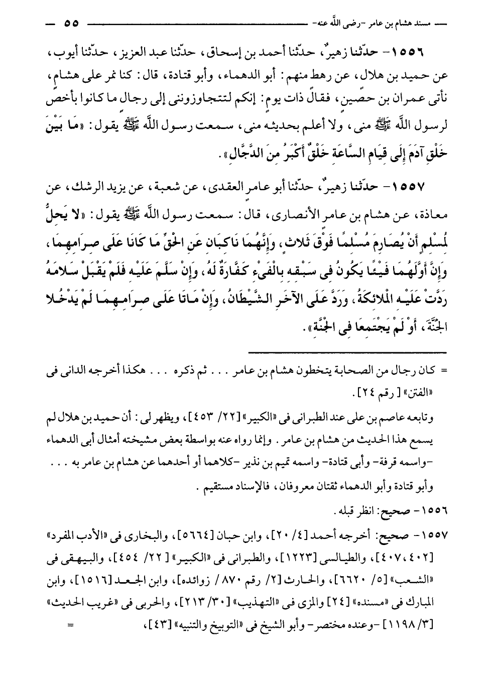 ١٥٥٧ - حدّثنا زهيرٌ، حدّثنا أبو عامرٍ العقدى، عن شعبة، عن يزيد الرشك، عن معاذة، عن هشام بن عامرٍ الأنصارى، قال: سمعت رسول الله - صلى الله عليه وسلم - يقول: "لا يَحِلُّ لمُسْلِمٍ أَنْ يُصَارِمَ مُسْلِمًا فَوْقَ ثَلاثٍ، وَإِنَّهُمَا نَاكبَانِ عَنِ الْحقِّ مَا كَانَا عَلَى صِرَامِهِمَا، وَإِنَّ أَوَّلَهُمَا فَيْئًا يَكُونُ فِي سَبْقِهِ بِالْفَىْءِ كَفَّارَةٌ لَهُ، وَإِنْ سَلَّمَ عَلَيْهِ فَلَمْ يَقْبَلْ سَلامَهُ رَدَّتْ عَلَيْهِ الملائِكَةُ، وَرَدَّ عَلَى الآخَرِ الشَّيْطَانُ، وَإِنْ مَاتَا عَلَى صِرَامِهِمَا لَمْ يَدْخُلا الجُنَّةَ، أَوْ لَمْ يَجْتَمِعَا فِي الجَنَّةِ".