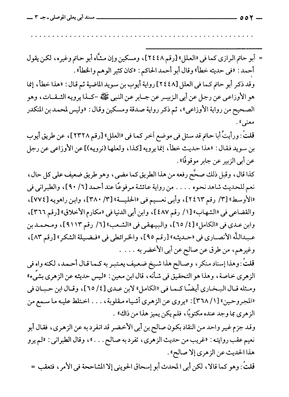 قلتُ: ورأيتُ أبا حاتم قد سئل في موضع آخر كما في "العلل" [رقم ٢٣٢٨]، عن طريق أيوب بن سويد فقال: "هذا حديث خطأ، إنما يرويه [كذا، ولعلها (نرويه)] عن الأوزاعى عن رجل عن أبى الزبير عن جابر موقوفًا".