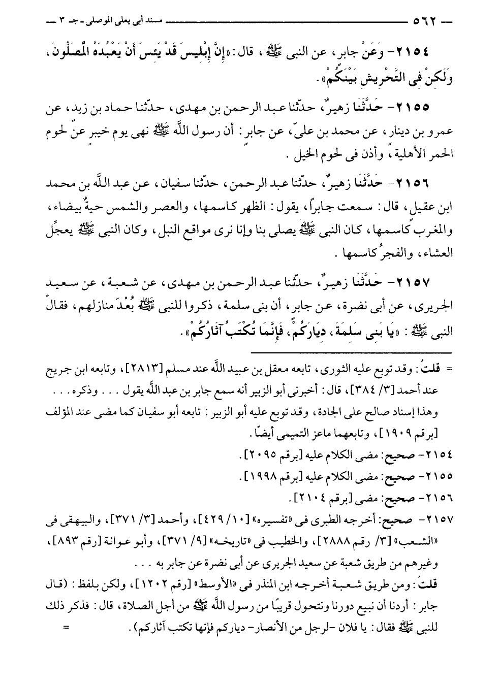 ٢١٥٧ - حَدَّثَنَا زهيرٌ، حدّثنا عبد الرحمن بن مهدى، عن شعبة، عن سعيدٍ الجريرى، عن أبى نضرة، عن جابرٍ، أن بنى سلمة، ذكروا للنبى - صلى الله عليه وسلم - بُعْدَ منازلهم، فقال النبي - صلى الله عليه وسلم -: "يَا بَنِى سَلِمَةَ، دِيَارَكُمْ، فَإنَّمَا تُكْتَبُ آثَارُكُمْ".