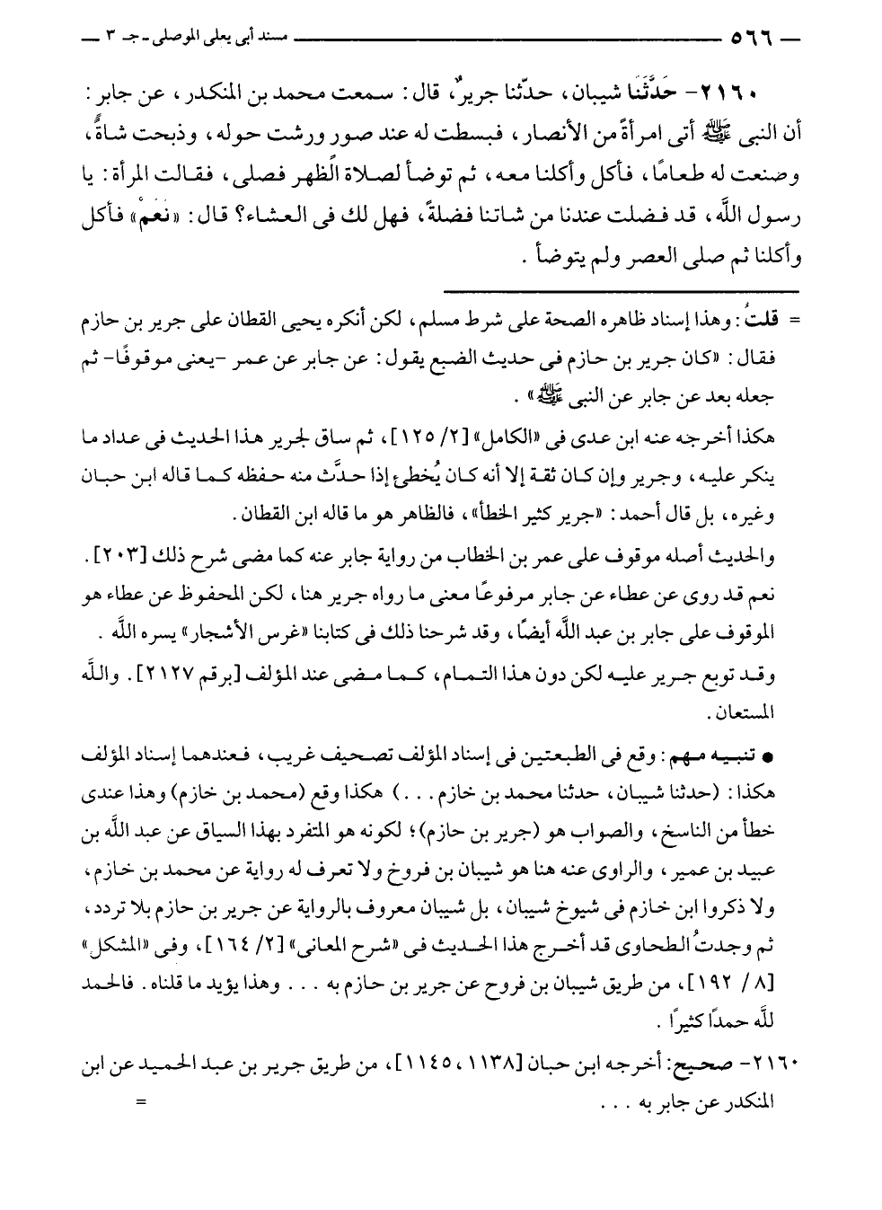 • تنبيه مهم: وقع في الطبعتين في إسناد المؤلف تصحيف غريب، فعندهما إسناد المؤلف مكذا: (حدثنا شيبان، حدثنا محمد بن خازم ... ) هكذا وقع (محمد بن خازم) وهذا عندى خطأ من الناسخ، والصواب هو (جرير بن حازم)، لكونه هو المتفرد بهذا السياق عن عبد الله بن عبيد بن عمير، والراوى عنه هنا هو شيبان بن فروخ ولا تعرف له رواية عن محمد بن خازم، ولا ذكروا ابن خازم في شيوخ شيبان، بل شيبان معروف بالرواية عن جرير بن حازم بلا تردد، ثم وجدتُ الطحاوى قد أخرج هذا الحديث في "شرح المعانى" [٢/ ١٦٤]، وفى "المشكل" [٨/ ١٩٢]، من طريق شيبان بن فروح عن جرير بن حازم به ... وهذا يؤيد ما قلناه. فالحمد للَّه حمدًا كثيرًا.