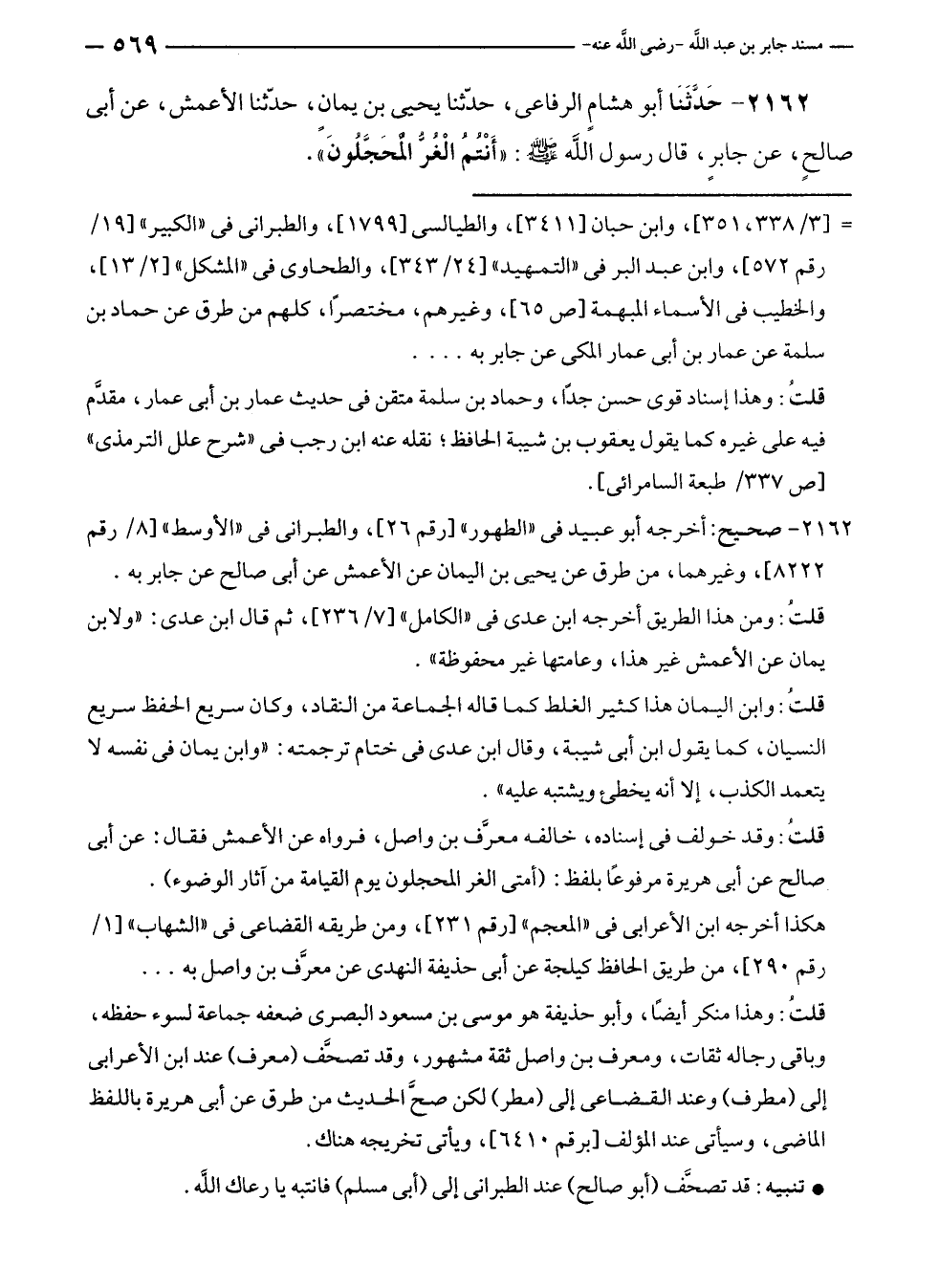 ٢١٦٢ - حَدَّثَنَا أبو هشامٍ الرفاعى، حدّثنا يحيى بن يمانٍ، حدّثنا الأعمش، عن أبى صالحٍ، عن جابرٍ، قال رسول الله - صلى الله عليه وسلم -: "أَنْتُمُ الْغُرُّ المَّحَجَّلُونَ".