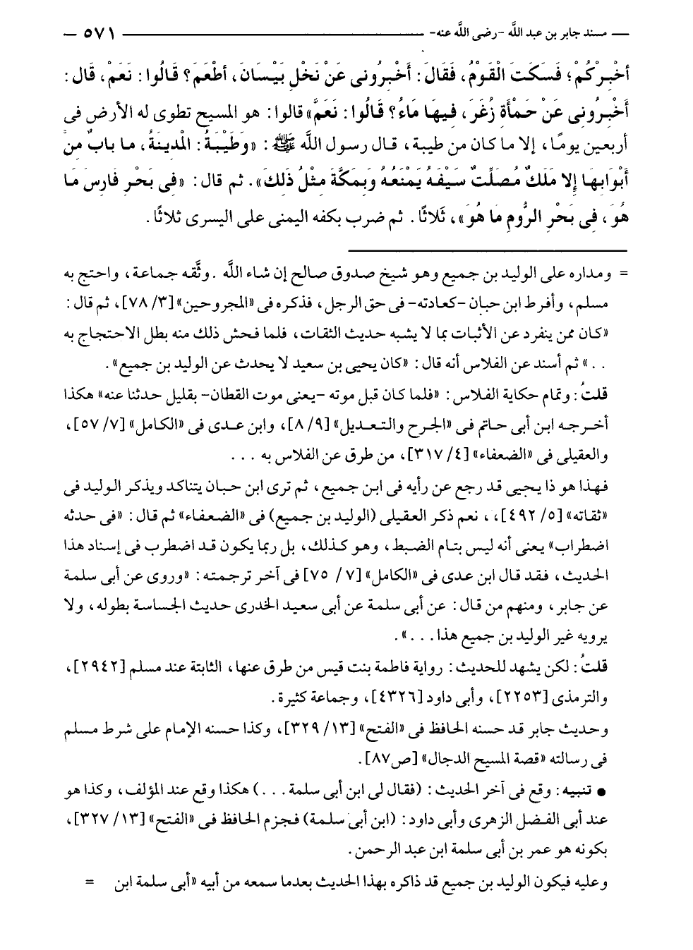 فهذا هو ذا يحيى قد رجع عن رأيه في ابن جميع، ثم ترى ابن حبان يتناكد ويذكر الوليد في "ثقاته" [٥/ ٤٩٢]، نعم ذكر العقيلى (الوليد بن جميع) في "الضعفاء" ثم قال: "في حدثه اضطراب" يعنى أنه ليس بتام الضبط، وهو كذلك، بل ربما يكون قد اضطرب في إسناد هذا الحديث، فقد قال ابن عدى في "الكامل" [٧/ ٧٥] في آخر ترجمته: "وروى عن أبى سلمة عن جابر، ومنهم من قال: عن أبى سلمة عن أبى سعيد الخدرى حديث الجساسة بطوله، ولا يرويه غير الوليد بن جميع هذا ... ".