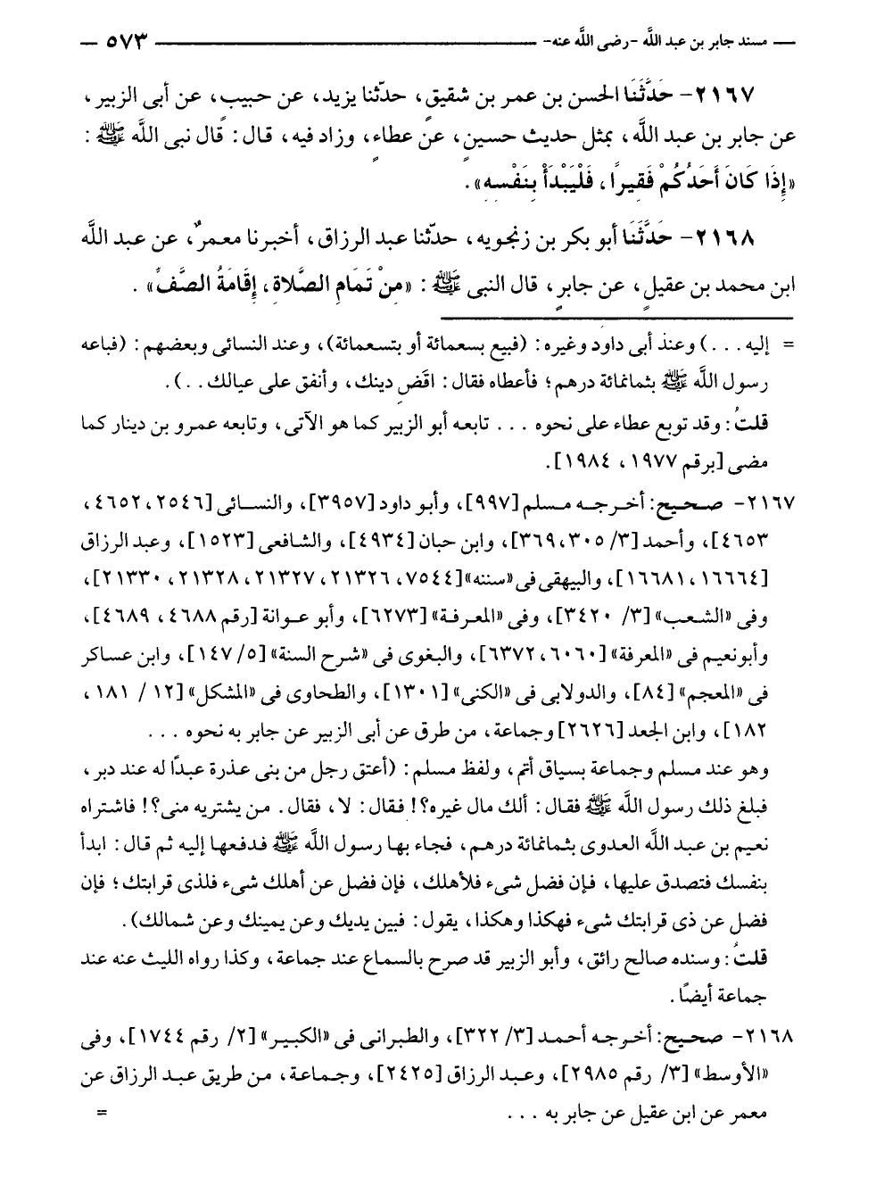 ٢١٦٧ - صحيح: أخرجه مسلم [٩٩٧]، وأبو داود [٣٩٥٧]، والنسائى [٢٥٤٦، ٤٦٥٢، ٤٦٥٣]، وأحمد [٣/ ٣٠٥، ٣٦٩]، وابن حبان [٤٩٣٤]، والشافعى [١٥٢٣]، وعبد الرزاق [١٦٦٦٤، ١٦٦٨١]، والبيهقى في "سننه" [٧٥٤٤، ٢١٣٢٦، ٢١٣٢٧، ٢١٣٢٨، ٢١٣٣٠]، وفى "الشعب" [٣/ ٣٤٢٠]، وفى "المعرفة" [٦٢٧٣]، وأبو عوانة [رقم ٤٦٨٨، ٤٦٨٩]، وأبو نعيم في "المعرفة" [٦٠٦٠، ٦٣٧٢]، والبغوى في "شرح السنة" [٥/ ١٤٧]، وابن عساكر في "المعجم" [٨٤]، والدولابى في "الكنى" [١٣٠١]، والطحاوى في "المشكل" [١٢/ ١٨١، ١٨٢]، وابن الجعد [٢٦٢٦] وجماعة، من طرق عن أبى الزبير عن جابر به نحوه ...