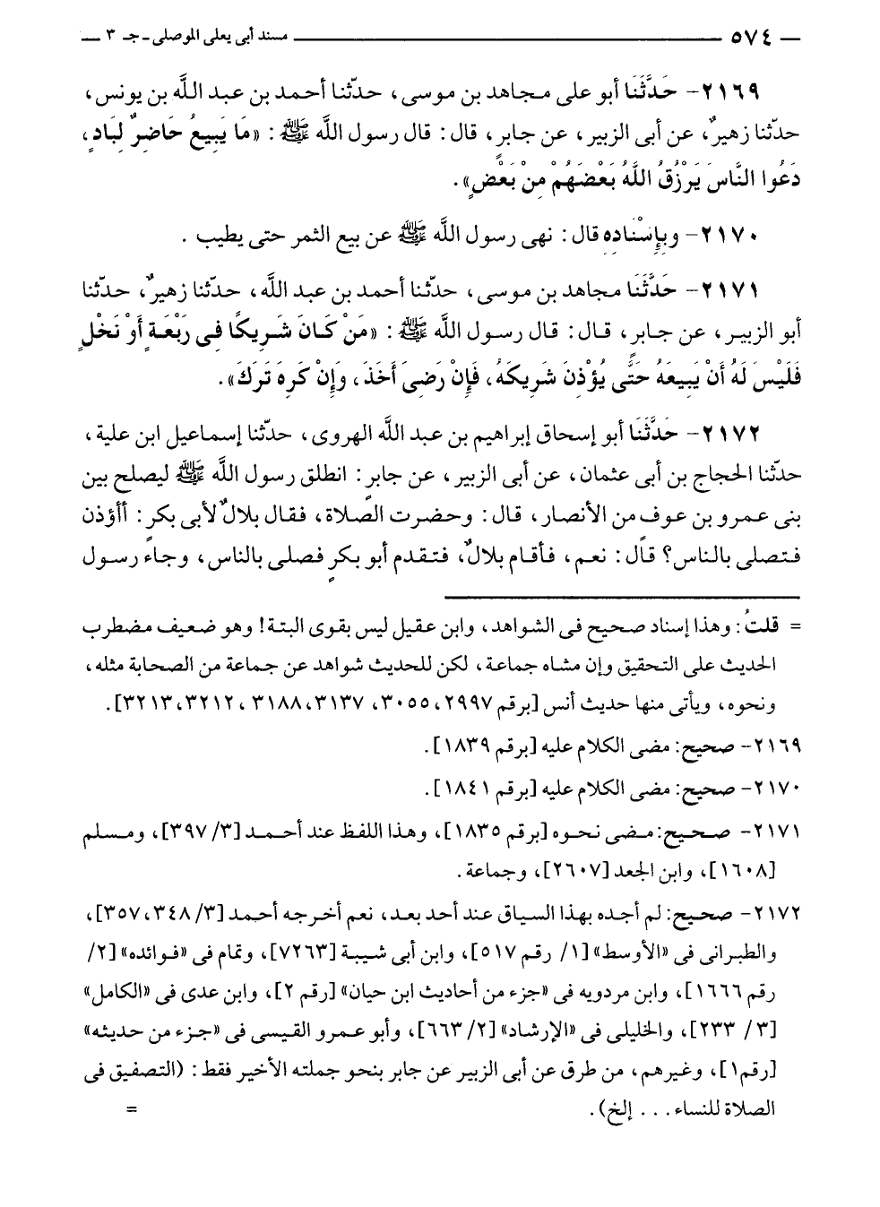 ٢١٧٢ - صحيح: لم أجده بهذا السياق عند أحد بعد، نعم أخرجه أجمد [٣/ ٣٤٨، ٣٥٧]، والطبرانى في "الأوسط" [١/ رقم ٥١٧]، وابن أبى شيبة [٧٢٦٣]، وتمام في "فوائده" [٢/ رقم ١٦٦٦]، وابن مردويه في "جزء من أحاديث ابن حيان" [رقم ٢]، وابن عدى في "الكامل" [٣/ ٢٣٣]، والخليلى في "الإرشاد" [٢/ ٦٦٣]، وأبو عمرو القيسى في "جزء من حديثه" [رقم ١]، وغيرهم، من طرق عن أبى الزبير عن جابر بنحو جملته الأخير فقط: (التصفيق في الصلاة للنساء ... إلخ). =