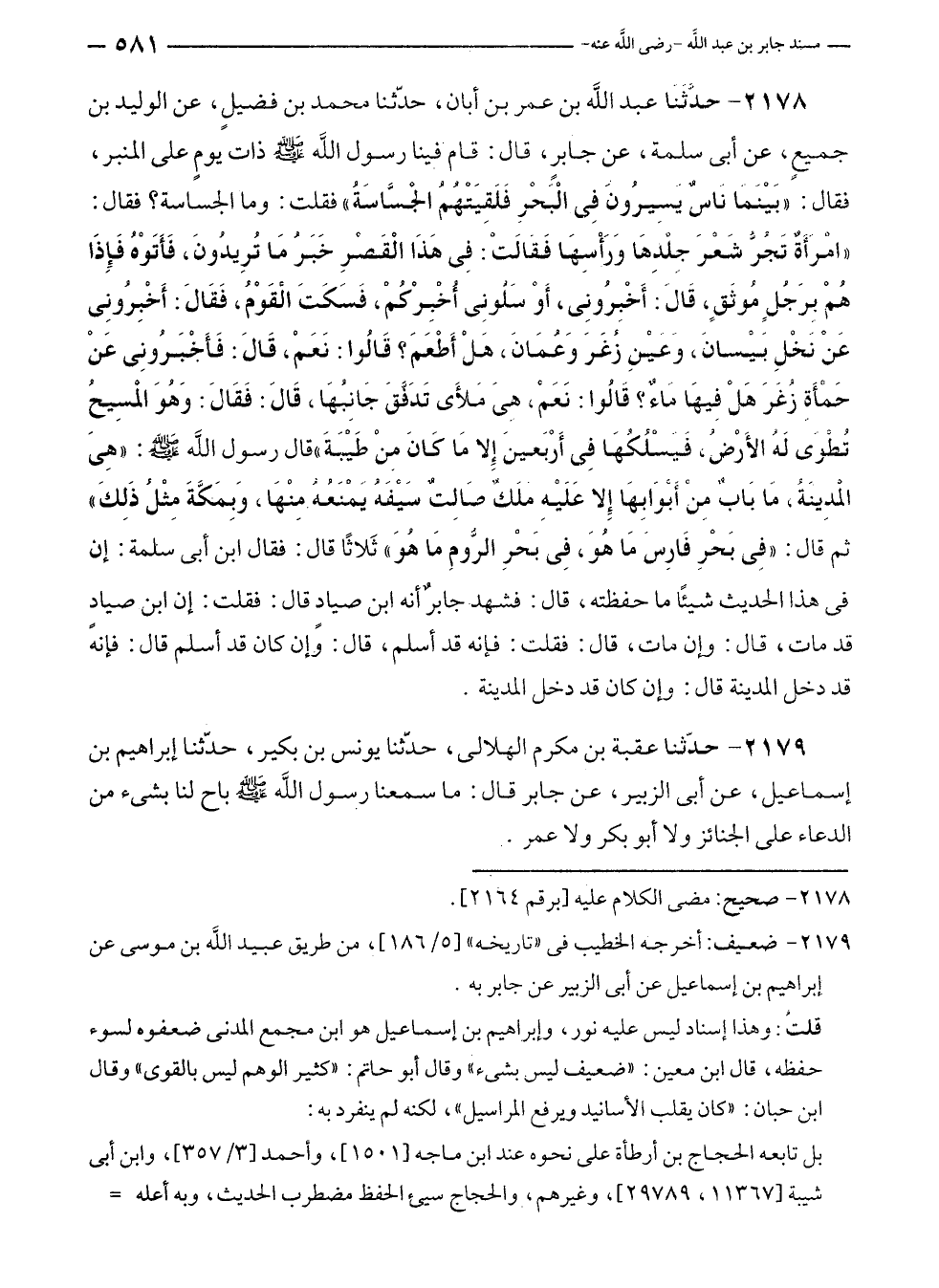 ٢١٧٨ - حدَّثَنَا عبد الله بن عمر بن أبان، حدّثنا محمد بن فضيلٍ، عن الوليد بن جميعٍ، عن أبى سلمة، عن جابرٍ، قال: قام فينا رسول الله - صلى الله عليه وسلم - ذات يومٍ على المنبر، فقال: "بَيْنَمَا ناسٌ يَسِيرُونَ فِي الْبَحْرِ فَلَقِيَتْهُمُ الجسَّاسَةُ" فقلت: وما الجساسة؟ فقال: "امْرَأَةٌ تَجُرُّ شَعْرَ جِلْدِهَا وَرَأْسِهَا فَقَالَتْ: فِي هَذَا الْقَصْرِ خَبَرُ مَا تُرِيدُونَ، فَأَتَوْهُ فَإِذَا هُمْ برَجُلٍ مُوثَقٍ، قَالَ: أَخْبِرُونِى، أَوْ سلُّونِى أُخْبِرْكُمْ، فَسَكَتَ الْقَوْمُ، فَقَالَ: أَخْبِرُونِى عَنْ نَخْلِ بَيْسانَ، وَعَيْنِ زُغَرَ وَعُمَانَ، هَلْ أَطْعَمَ؟ قَالُوا: نَعَمْ، قَالَ: فَأَخْبَرُونِى عَنْ حَمْأَةِ زُغَرَ هَلْ فِيهَا مَاءٌ؟ قَالُوا: نَعَمْ، هِىَ مَلأَى تَدَفَّقَ جَانِبُهَا، قَالَ: فَقَال: وَهُوَ المسِيحُ تُطْوَى لَهُ الأَرْضُ، فَيَسْلُكُهَا فِي أَرْبَعينَ إِلا مَا كَانَ مِنْ طَيْبَةَ" قال رسول الله - صلى الله عليه وسلم -: "هِىَ المدِينَةُ، مَا بَابٌ مِنْ أَبْوَابِهَا إِلا عَلَيْهِ ملَكٌ صَالِتٌ سَيْفَهُ يَمْنَعُهُ مِنْهَا، وَبِمَكَّةَ مِثْلُ ذَلِكَ" ثم قال: "فِي بَحْرِ فَارِسَ مَا هُوَ، فِي بَحْرِ الرُّومِ مَا هُوَ" ثَلاثًا قال: فقال ابن أبى سلمة: إن في هذا الحديث شيئًا ما حفظته، قال: فشهد جابرٌ أنه ابن صيادٍ قال: فقلت: إن ابن صيادٍ قد مات، قال: وإن مات، قال: فقلت: فإنه قد أسلم، قال: وإن كان قد أسلم قال: فإنه قد دخل المدينة قال: وإن كان قد دخل المدينة.
