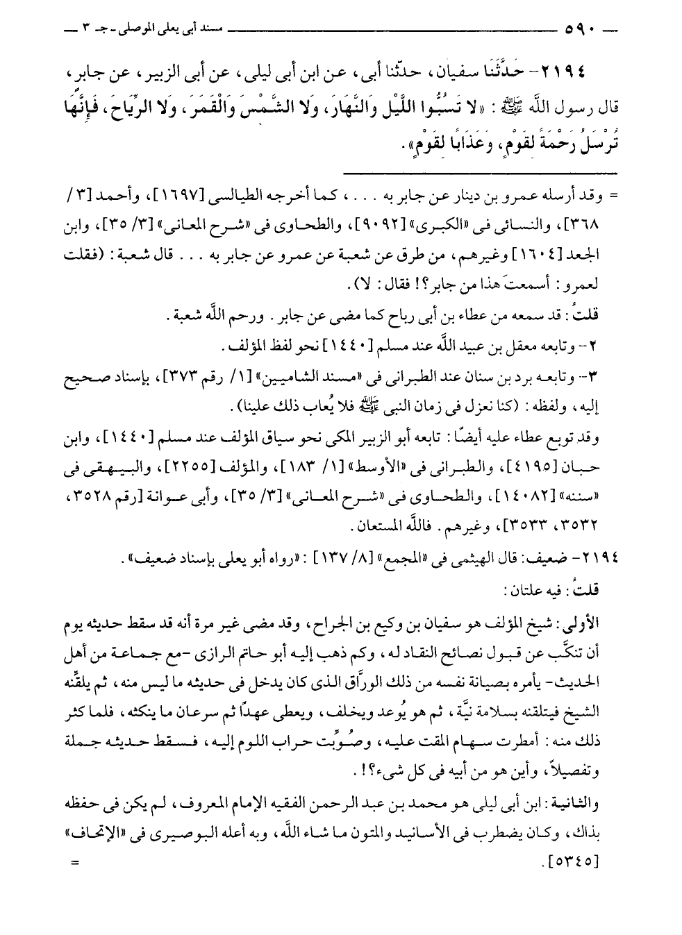 ٢١٩٤ - حَدَّثَنَا سفيان، حدّثنا أبى، عن ابن أبى ليلى، عن أبى الزبير، عن جابرٍ، قال رسول الله - صلى الله عليه وسلم -: "لا تَسُبُّوا اللَّيْل وَالنَّهَارَ، وَلا الشَّمسَ وَالْقَمَرَ، وَلا الرِّيَاحَ، فَإِنَّهَا تُرْسَلُ رحْمَةً لقَوْمٍ، وَعَذَابًا لِقَوْمٍ".