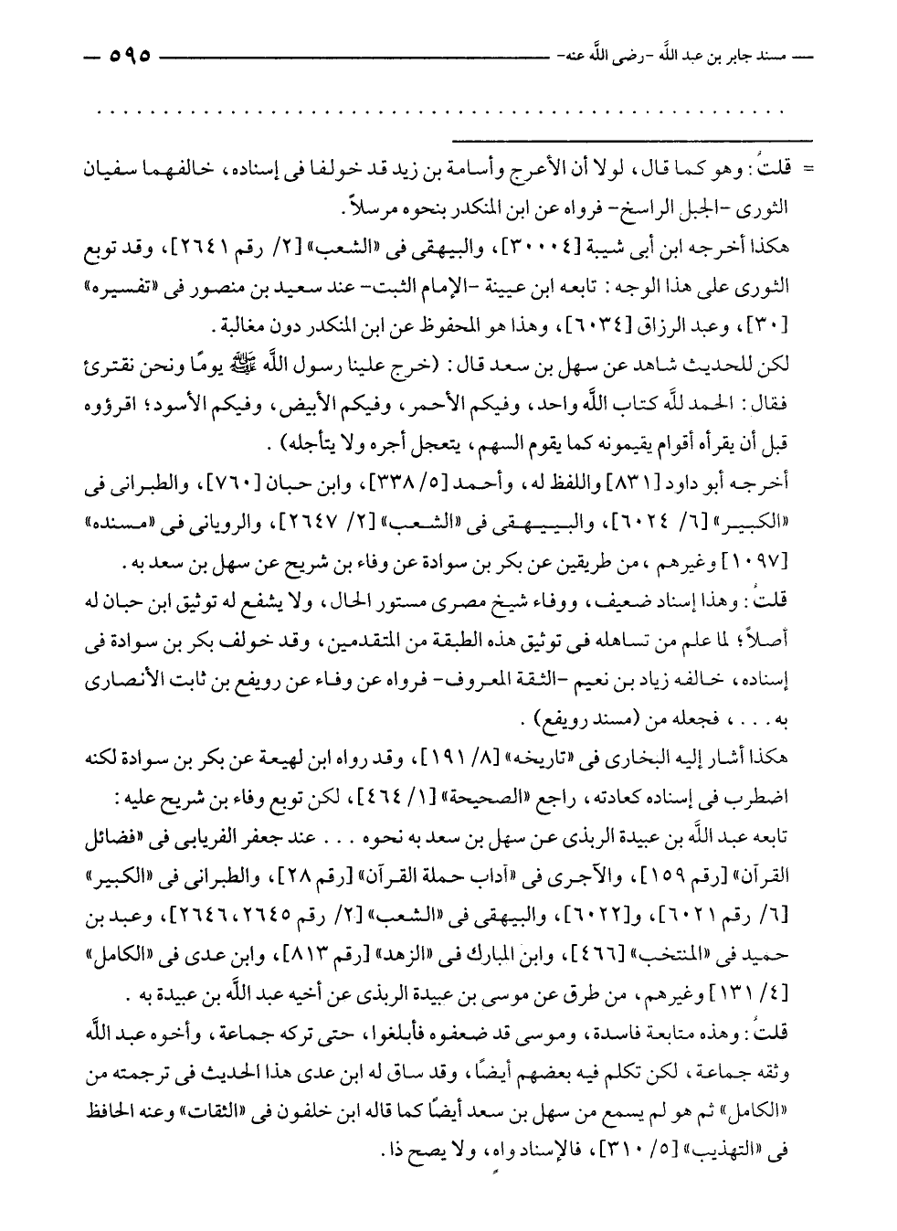 قلتْ: وهذا إسناد ضعيف، ووفاء شيخ مصرى مستور الحالط، ولا يشفع له توثيق ابن حبان له أصلًا؛ لما علم من تساهله في توثيق هذه الطبقة من المتقدمين، وقد خولف بكر بن سوادة في إسناده، خالفه زياد بن نعيم - الثقة المعروف - مرواه عن وفاء عن رويفع بن ثابت الأنصارى به ... ، فجعله من (مسند رويفع).