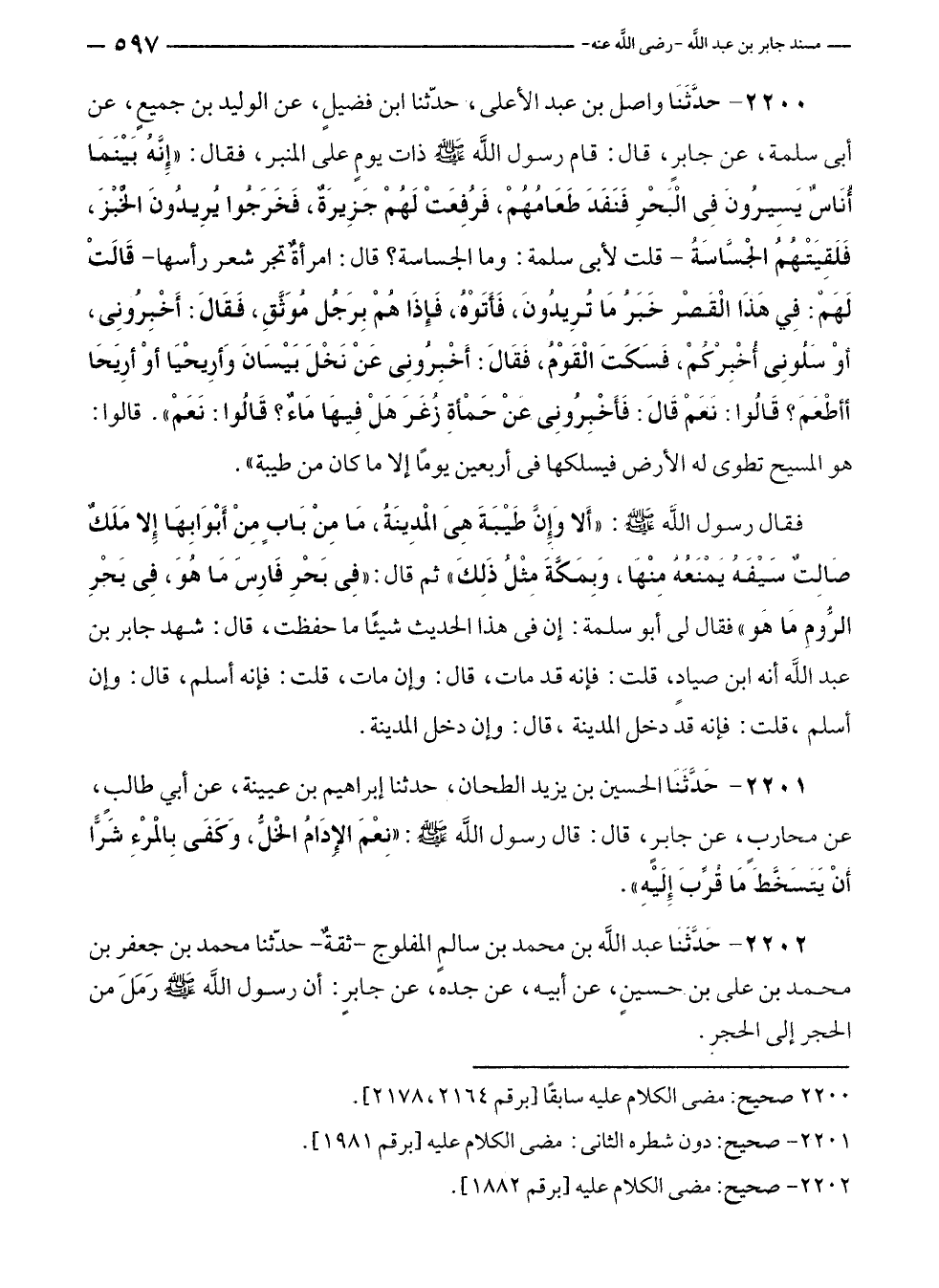 ٢٢٠٠ - حدَّثَنَا واصل بن عبد الأعلى، حدّثنا ابن فضيلٍ، عن الوليد بن جميعٍ، عن أبى سلمة، عن جابرٍ، قال: قام رسول الله - صلى الله عليه وسلم - ذات يومٍ على المنبر، فقال: "إنَّهُ بَيْنَمَا أُنَاسٌ يَسِيرُونَ فِي الْبَحْرِ فَنَفَدَ طَعَامُهُمْ، فَرُفِعَتْ لَهُمْ جَزِيرَةٌ، فَخَرَجُوا يُرِيدُونَ الخُبْزَ، فَلَقِيَتْهُمُ الجَسَّاسَة - قلت لأبى سلمة: وما الجساسة؟ قال: امرأةٌ تجر شعر رأسها - قَالَتْ لَهَمْ: فِي هَذَا الْقَصْر خَبَرُ مَا تُرِيدُونَ، فَأَتَوْهُ، فَإِذَا هُمْ بِرَجُلٍ مُوَثَّقٍ، فَقَالَ: أَخْبِرُونِى، أوْ سَلُونِى أخْبِرْكُمْ، فَسَكَتَ الْقَوْمُ، فَقَالَ: أَخْبِرونِى عَنْ نَخْلَ بَيْسَانَ وَأرِيحْيَا أوْ أرِيَحَا أأطْعَمَ؟ قَالُوا: نَعَمْ قَالَ: فَأَخْبِرُونِى عَنْ حَمْأةِ زُغَرَ هَلْ فِيهَا مَاءٌ؟ قَالُوا: نَعَمْ". قالوا: هو المسيح تطوى له الأرض فيسلكها في أربعين يومًا إلا ما كان من طيبة".