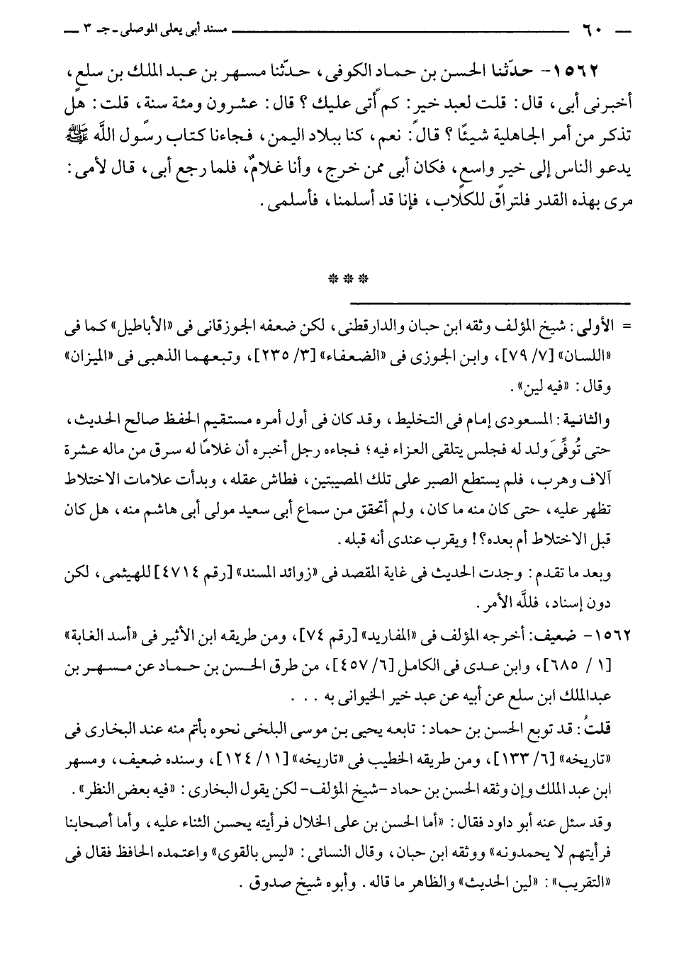 ١٥٦٢ - حدّثنا الحسن بن حمادٍ الكوفى، حدّثنا مسهر بن عبد الملك بن سلعٍ، أخبرنى أبى، قال: قلت لعبد خيرٍ: كم أتى عليك؟ قال: عشرون ومئة سنةٍ، قلت: هل تذكر من أمر الجاهلية شيئًا؟ قال: نعم، كنا ببلاد اليمن، فجاءنا كتاب رسول الله - صلى الله عليه وسلم - يدعو الناس إلى خير واسعٍ، فكان أبى ممن خرج، وأنا غلامٌ، فلما رجع أبى، قال لأمى: مرى بهذه القدر فلتراق للكلاب، فإنا قد أسلمنا، فأسلمى.