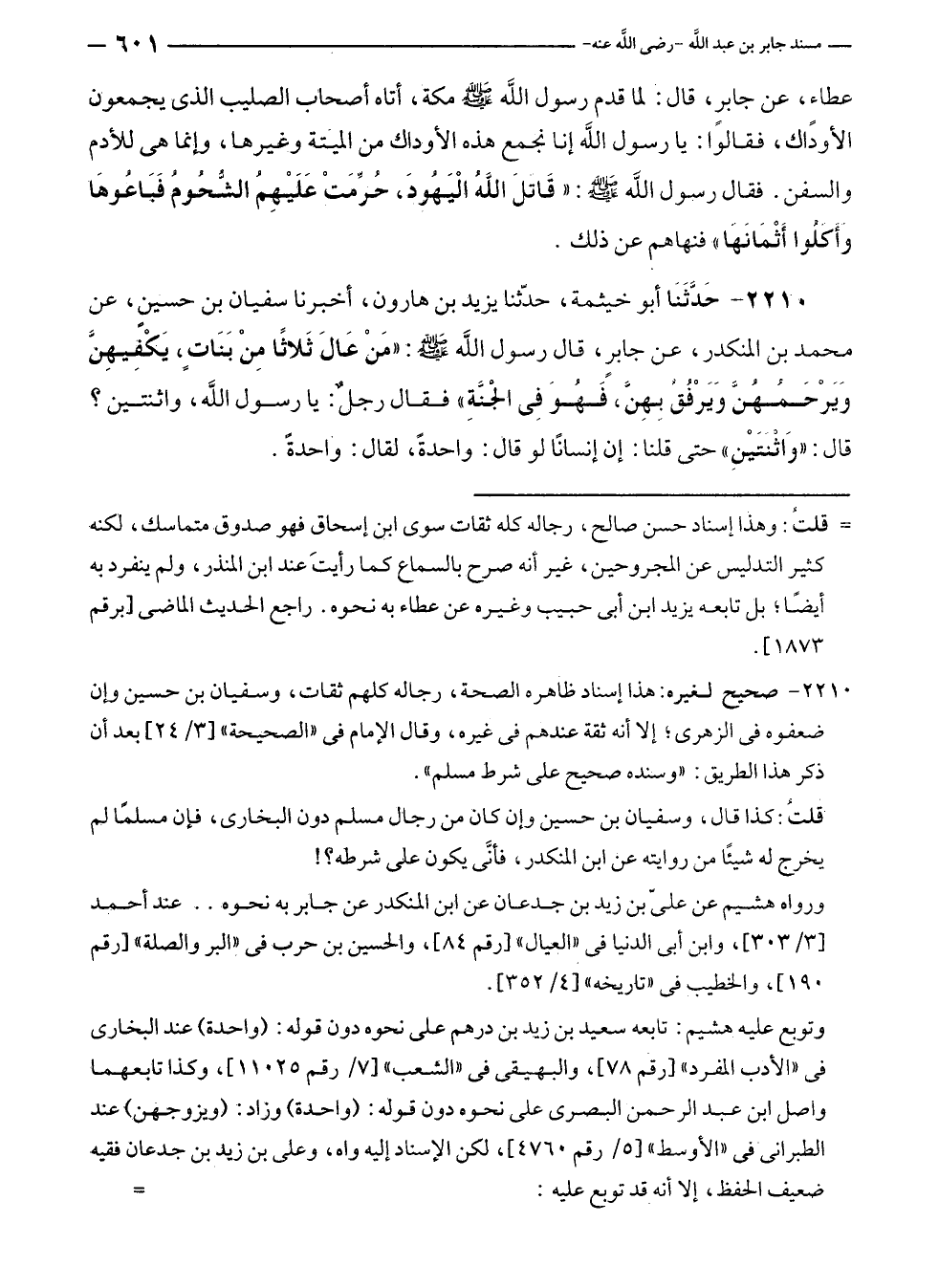 ٢٢١٠ - حَدَّثَنَا أبو خيثمة، حدّثنا يزيد بن هارون، أخبرنا سفيان بن حسينٍ، عن محمد بن المنكدر، عن جابرٍ، قال رسول الله - صلى الله عليه وسلم -: "مَنْ عَالَ ثَلاثًا مِنْ بَنَاتٍ، يَكْفِيهِنَّ وَيَرْحَمُهُنَّ وَيَرْفُقُ بِهِنَّ، فَهُوَ فِي الجَنَّةِ" فقال رجل: يا رسول الله، واثنتين؟ قال: "وَاثنَتَيْنِ" حتى قلنا: إن إنسانًا لو قال: واحدةً، لقال: واحدةً.