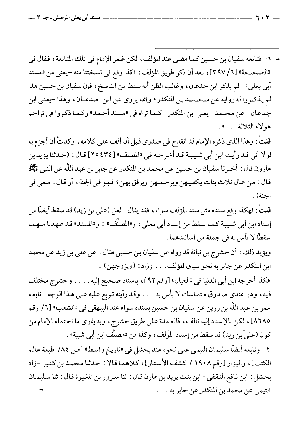 = ١ - فتابعه سفيان بن حسين كما مضى عند المؤلف، لكن غمز الإمام في تلك المتابعة، فقال في "الصحيحة" [٦/ ٣٩٧]، بعد أن ذكر طريق المؤلف: "كذا وقع في نسختنا منه - يعنى من "مسند أبى يعلى" - لم يذكر ابن جدعان، وغالب الظن أنه سقط من الناسخ، فإن سفيان بن حسين هذا لم يذكروا له رواية عن محمد بن المنكدر؛ وإنما يروى عن ابن جدعان، وهذا - يعنى ابن جدعان - عن محمد - يعنى ابن المنكدر - كما تراه في "مسند أحمد" وكما ذكروا في تراجم هؤلاء الثلاثة ... ".