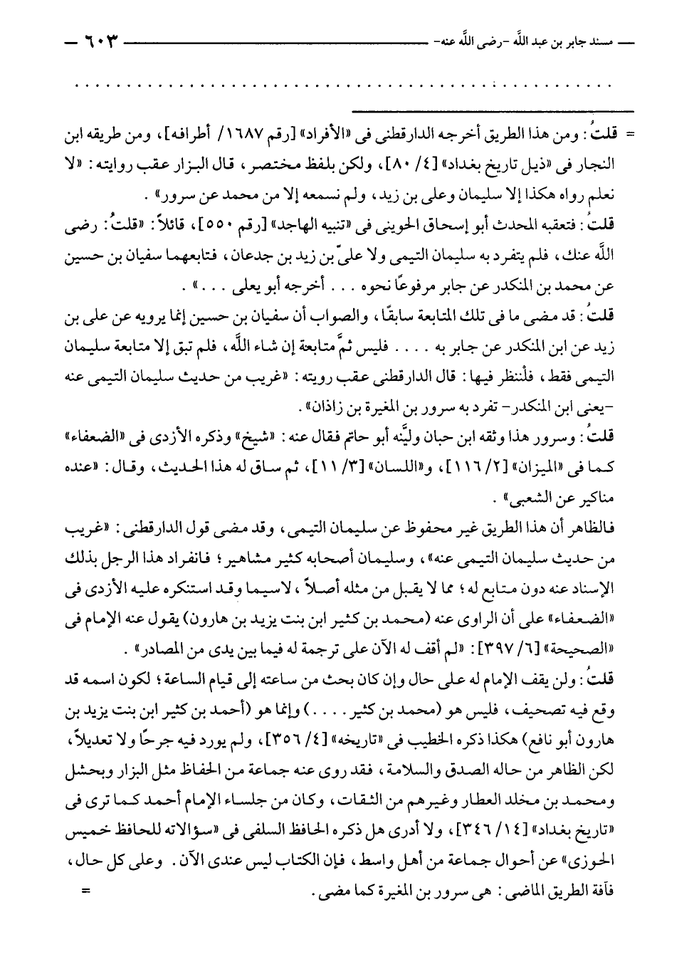 قلتُ: قد مضى ما في تلك المتابعة سابقًا، والصواب أن سفيان بن حسين إنما يرويه عن علي بن زيد عن ابن المنكدر عن جابر به .... فليس ثمَّ متابعة إن شاء الله، فلم تبق إلا متابعة سليمان التيمى فقط، فلْننظر فيها: قال الدارقطنى عقب رويته: "غريب من حديث سليمان التيمى عنه - يعنى ابن المنكدر - تفرد به سرور بن المغيرة بن زاذان".