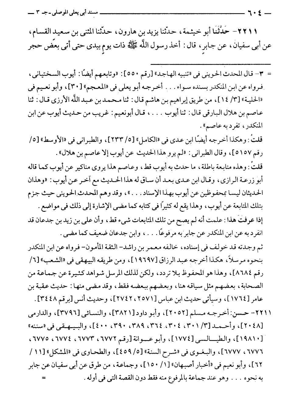 ٢٢١١ - حَدَّثَنَا أبو خيثمة، حدّثنا يزيد بن هارون، حدّثنا المثنى بن سعيدٍ القسام، عن أبى سفيان، عن جابرٍ، قال: أخذ رسول الله - صلى الله عليه وسلم - ذات يومٍ بيدى حتى أتى بعض حجر