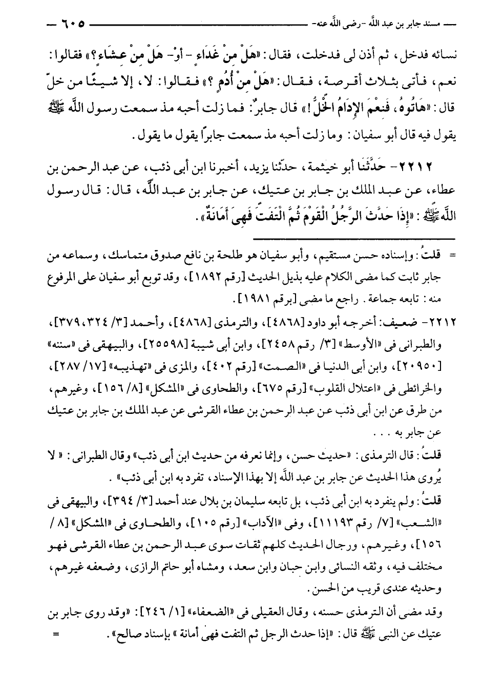 ٢٢١٢ - ضعيف: أخرجه أبو داود [٤٨٦٨]، والترمذى [٤٨٦٨]، وأحمد [٣/ ٣٢٤، ٣٧٩]، والطبرانى في "الأوسط" [٣/ رقم ٢٤٥٨]، وابن أبي شيبة [٢٥٥٩٨]، والبيهقى في "سننه" [٢٠٩٥٠]، وابن أبى الدنيا في "الصمت" [رقم ٤٠٢]، والمزى في "تهذيبه" [١٧/ ٢٨٧]، والخرائطى في "اعتلال القلوب" [رقم ٦٧٥]، والطحاوى في "المشكل" [٨/ ١٥٦]، وغيرهم، من طرق عن ابن أبى ذئب عن عبد الرحمن بن عطاء القرشى عن عبد الملك بن جابر بن عتيك عن جابر به ...