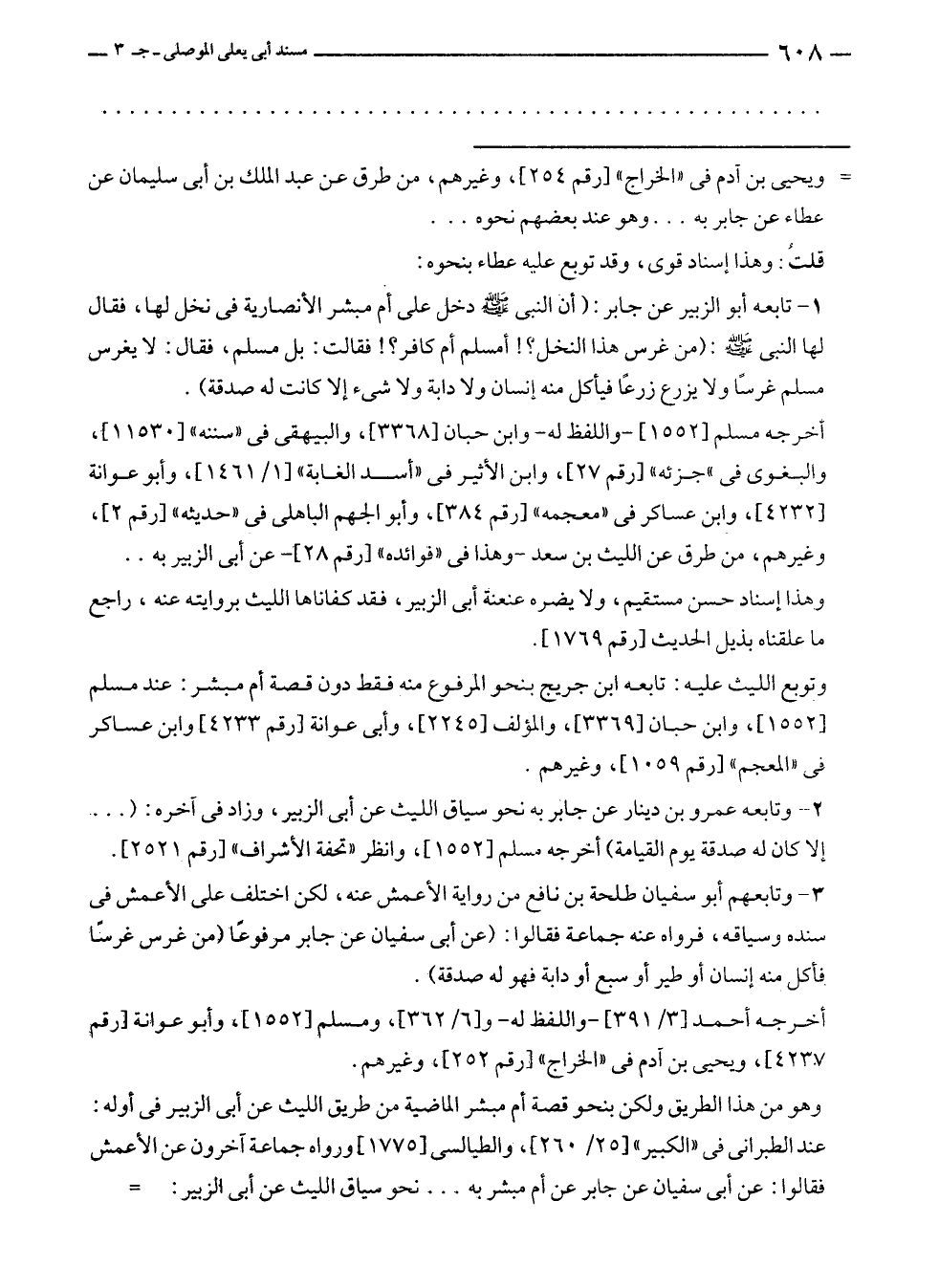 ١ - تابعه أبو الزبير عن جابر: (أن النبي - صلى الله عليه وسلم - دخل على أم مبشر الأنصارية في نخل لها، فقال لها النبي - صلى الله عليه وسلم -: (من غرس هذا النخل؟! أمسلم أم كافر؟! فقالت: بل مسلم، فقال: لا يغرس مسلم غرسًا ولا يزرع زرعًا فيأكل منه إنسان ولا دابة ولا شئ إلا كانت له صدقة).