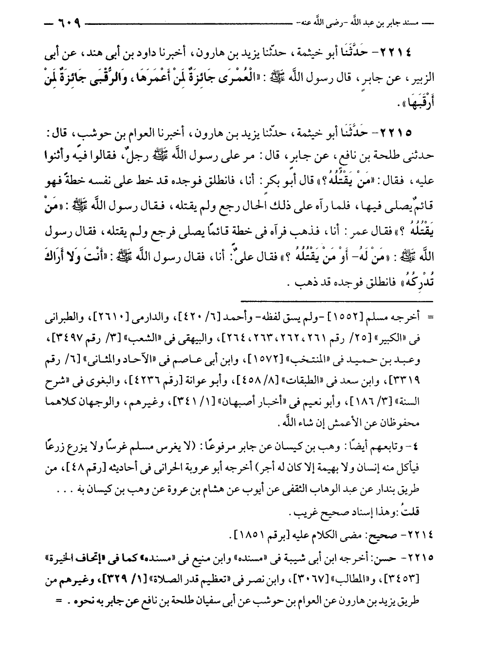 ٢٢١٥ - حَدَّثنا أبو خيثمة، حدّثنا يزيد بن هارون، أخبرنا العوام بن حوشبٍ، قال: حدثنى طلحة بن نافعٍ، عن جابرٍ، قال: مر على رسول الله - صلى الله عليه وسلم - رجلٌ، فقالوا فيه وأثنوا عليه، فقال: "مَنْ يَقْتُلُهُ؟ " قال أبو بكرٍ: أنا، فانطلق فوجده قد خط على نفسه خطةً فهو قائمٌ يصلى فيها، فلما رآه على ذلك الحال رجع ولم يقتله، فقال رسول الله - صلى الله عليه وسلم -: "مَنْ يَقْتُلُهُ؟ " فقال عمر: أنا، فذهب فرآه في خطةٍ قائمًا يصلى فرجع ولم يقتله، فقال رسول الله - صلى الله عليه وسلم -: "مَن لَهُ - أَوْ مَنْ يَقْتُلُهُ؟ " فقال عليٌ: أنا، فقال رسول الله - صلى الله عليه وسلم -: "أَنْتَ وَلا أَرَاكَ تُدْرِكُهُ" فانطلق فوجده قد ذهب.