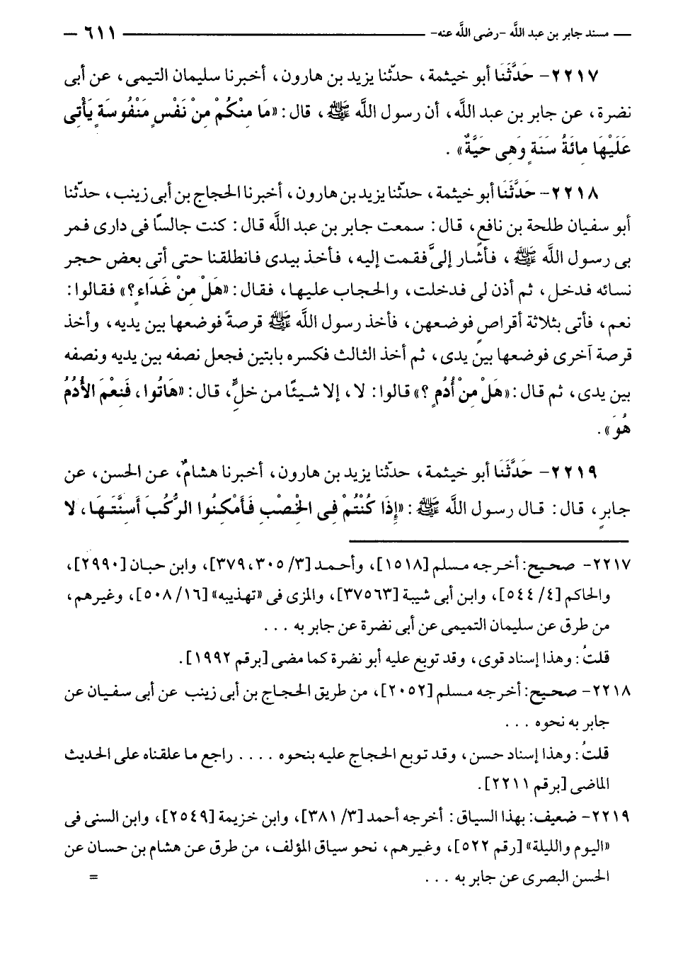 ٢٢١٧ - صحيح: أخرجه مسلم [١٥١٨]، وأحمد [٣/ ٣٠٥، ٣٧٩]، وابن حبان [٢٩٩٠]، والحاكم [٤/ ٥٤٤]، وابن أبى شيبة [٣٧٥٦٣]، والمزى في "تهذيبه" [١٦/ ٥٠٨]، وغيرهم، من طرق عن سليمان التميمى عن أبى نضرة عن جابر به ...