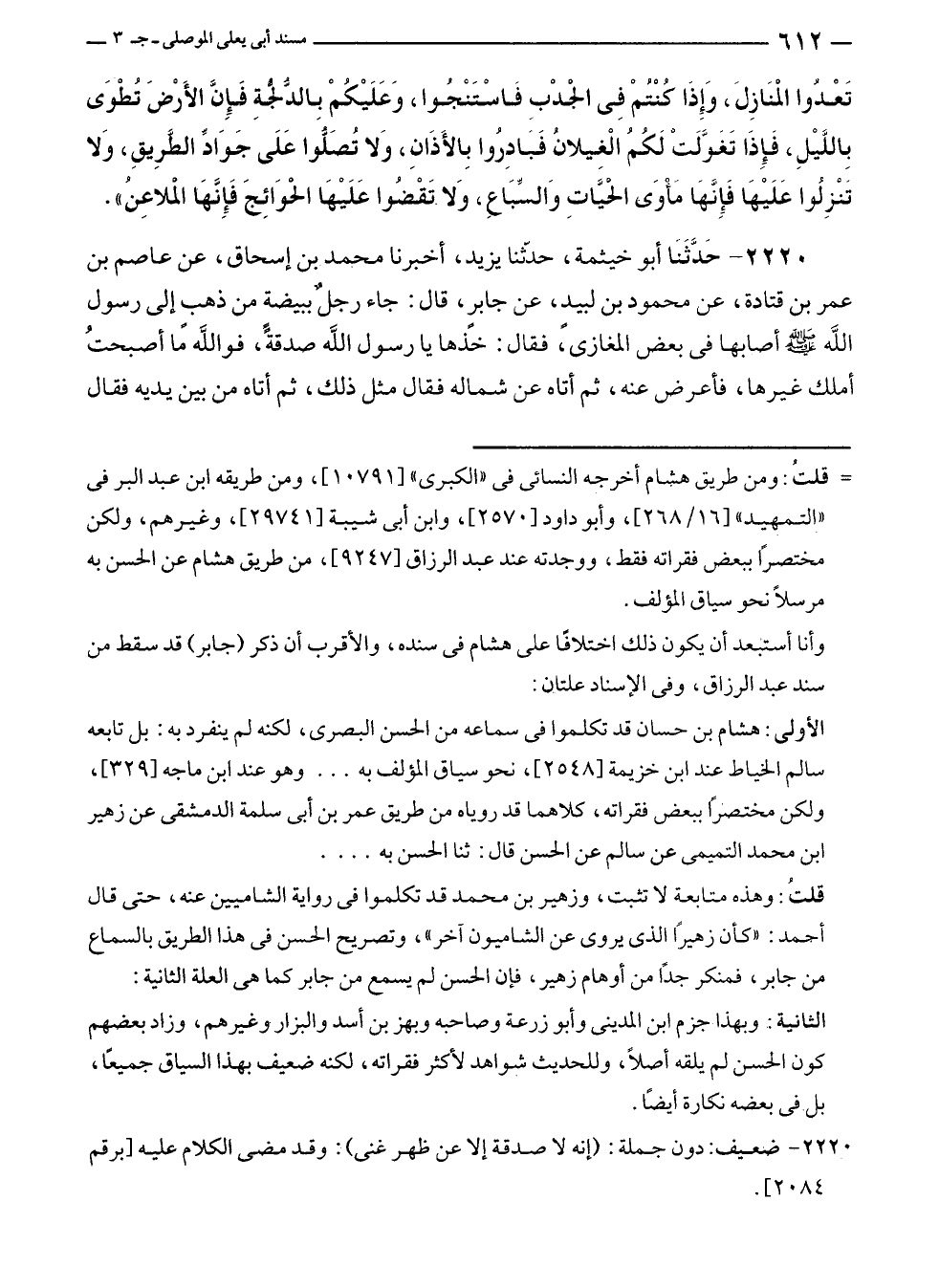 قلتُ: وهذه متابعة لا تثبت، وزهير بن محمد قد تكلموا في رواية الشاميين عنه، حتى قال أحمد: "كأن زهيرًا الذي يروى عن الشاميون آخر"، وتصريح الحسن مى هذا الطريق بالسماع من جابر، فمنكر جدًّا من أوهام زهير، فإن الحسن لم يسمع من جابر كما هي العلة الثانية: الثانية: وبهذا جزم ابن المدينى وأبو زرعة وصاحبه وبهز بن أسد والبزار وغيرهم، وزاد بعضهم كون الحسن لم يلقه أصلًا، وللحديث شواهد لأكثر فقراته، لكنه ضعيف بهذا السياق جميعًا، بل في بعضه نكارة أيضًا.