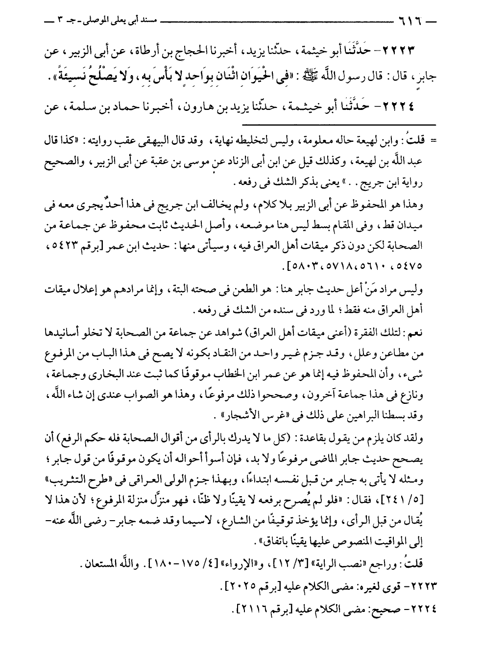 ٢٢٢٣ - حدَّثَنَا أبو خيثمة، حدّثنا يزيد، أخبرنا الحجاج بن أرطاة، عن أبى الزبير، عن جابرٍ، قال: قال رسول الله - صلى الله عليه وسلم -: "فِي الحيَوَانِ اثْنَانِ بِوَاحِدٍ لا بَأْسَ بِهِ، وَلا يَصْلُحُ نَسِيئَةً".