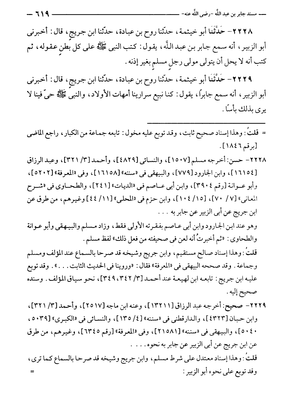٢٢٢٨ - حَدَّثَنَا أبو خيثمة، حدّثنا روح بن عبادة، حدّثنا ابن جريجٍ، قال: أخبرنى أبو الزبير، أنه سمع جابر بن عبد الله، يقول: كتب النبي - صلى الله عليه وسلم - على كل بطنٍ عقوله، ثم كتب أنه لا يحل أن يتولى مولى رجلٍ مسلمٍ بغير إذنه.