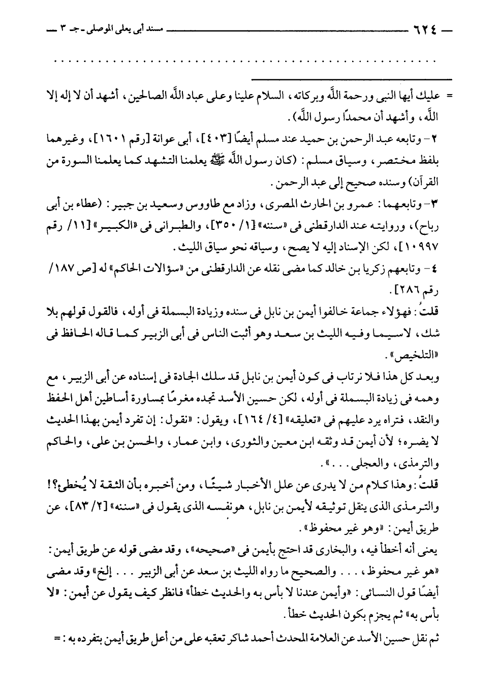 ثم نقل حسين الأسد عن العلامة المحدث أحمد شاكر تعقبه على من أعل طريق أيمن بتفرده به:=
