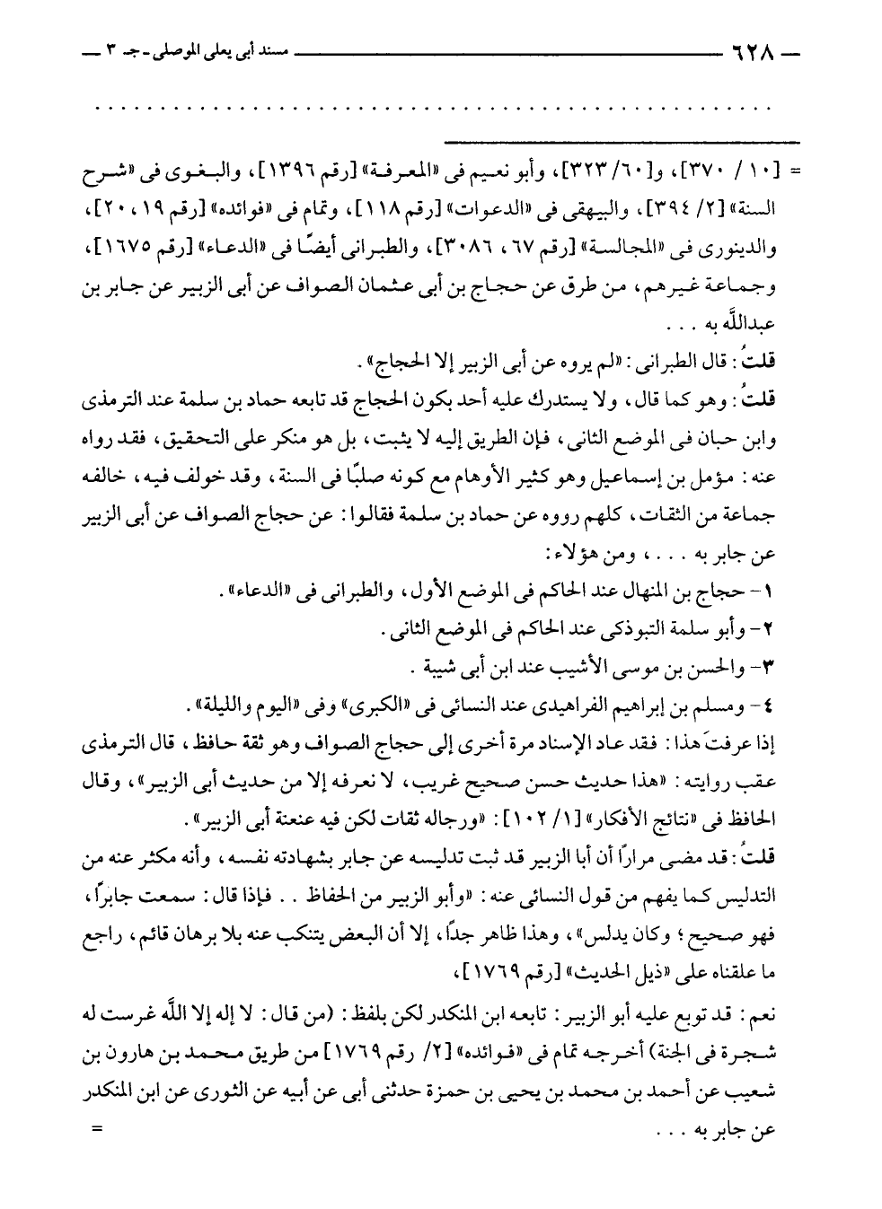 قلتُ: وهو كما قال، ولا يستدرك عليه أحد بكون الحجاج قد تابعه حماد بن سلمة عند الترمذى وابن حبان في الموضع الثاني، فإن الطريق إليه لا يثبت، بل هو منكر على التحقيق، فقد رواه عنه: مؤمل بن إسماعيل وهو كثير الأوهام مع كونه صلبًا في السنة، وقد خولف فيه، خالفه جماعة من الثقات، كلهم رووه عن حماد بن سلمة فقالوا: عن حجاج الصواف عن أبى الزبير عن جابر به ... ، ومن هؤلاء: