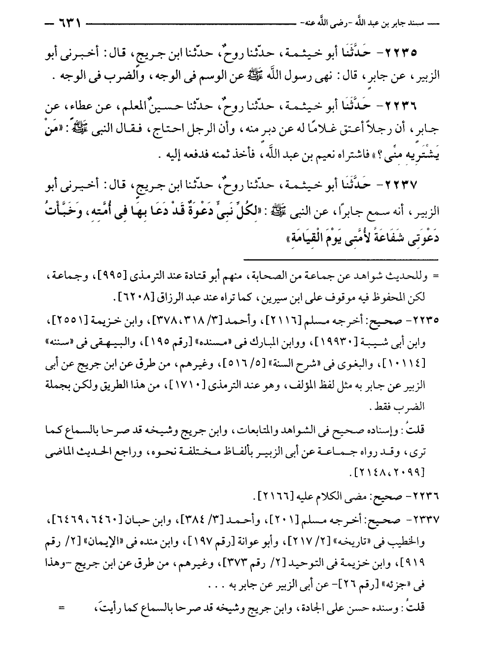 ٢٢٣٥ - حَدَّثَنَا أبو خيثمة، حدّثنا روحٌ، حدّثنا ابن جريجٍ، قال: أخبرنى أبو الزبير، عن جابرٍ، قال: نهى رسول الله - صلى الله عليه وسلم - عن الوسم في الوجه، والضرب في الوجه.